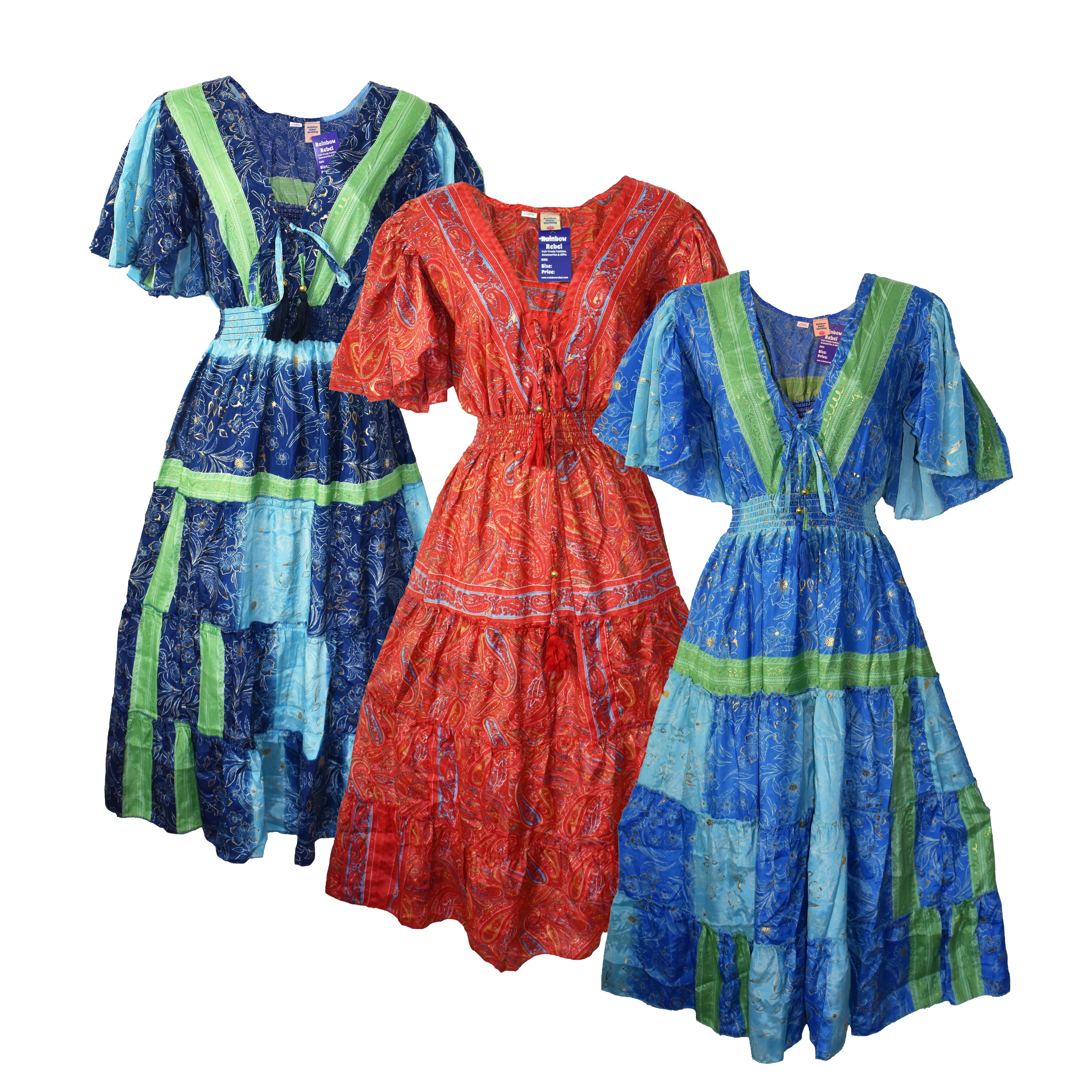 Step into style with these stunning dresses, designed to flatter every figure! Featuring a chic low V-neck front and a slightly higher V-back, plus an adjustable drawcord to perfect the bust fit. The fitted waist with a shirred elastic panel flows beautifully into a floaty, lower calf length skirt, while angel wing sleeves give it that effortlessly elegant touch. One size fits most, ideal for sizes 12-16/18 due to elastic. A must-have for effortless, head-turning glamour!  Available in a mix of blue and green tones, a selection will be given.