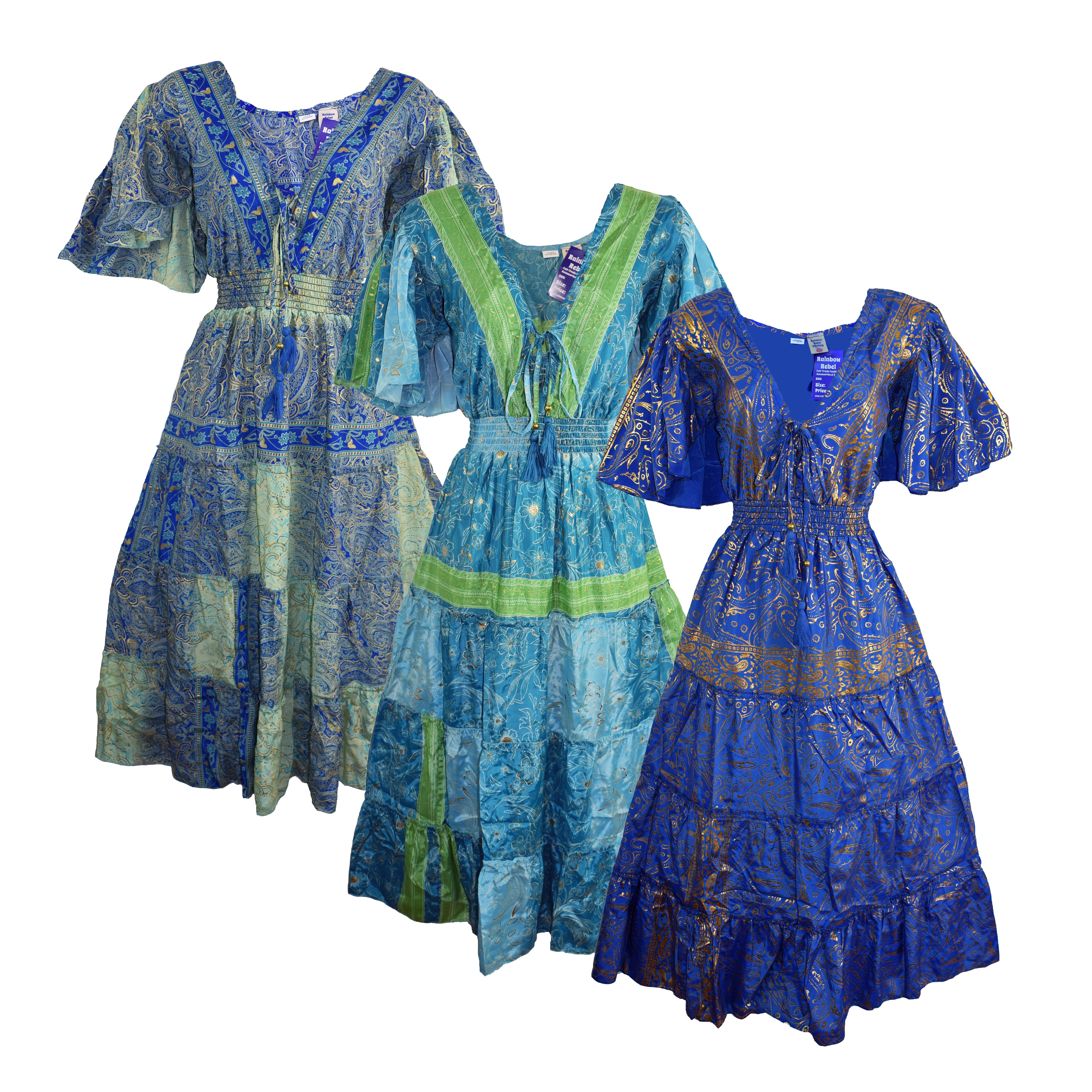 Step into style with these stunning dresses, designed to flatter every figure! Featuring a chic low V-neck front and a slightly higher V-back, plus an adjustable drawcord to perfect the bust fit. The fitted waist with a shirred elastic panel flows beautifully into a floaty, lower calf length skirt, while angel wing sleeves give it that effortlessly elegant touch. One size fits most, ideal for sizes 12-16/18 due to elastic. A must-have for effortless, head-turning glamour!  Available in a mix of blue and green tones, a selection will be given.