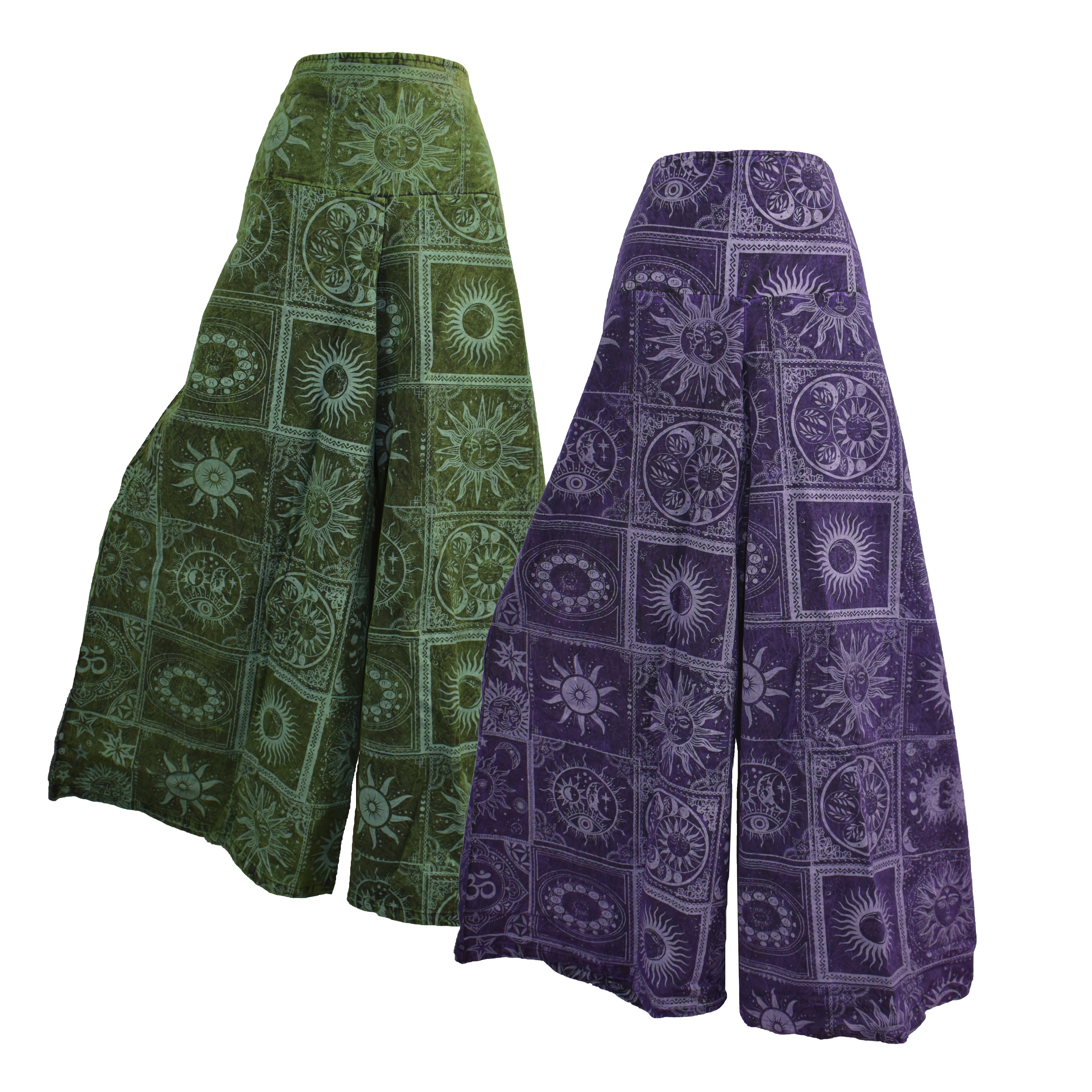 Made from soft, stonewashed mid weight cotton, these celestial print trousers combine comfort and boho charm. Featuring a flattering wide-leg design that flows like a skirt, they offer the ease of trousers with a dreamy, free-spirited look. With deep hip pockets and an elasticated back waistband for a perfect fit. Cold machine wash and line dry. Available in three sizes and two colours. Great worn all year round