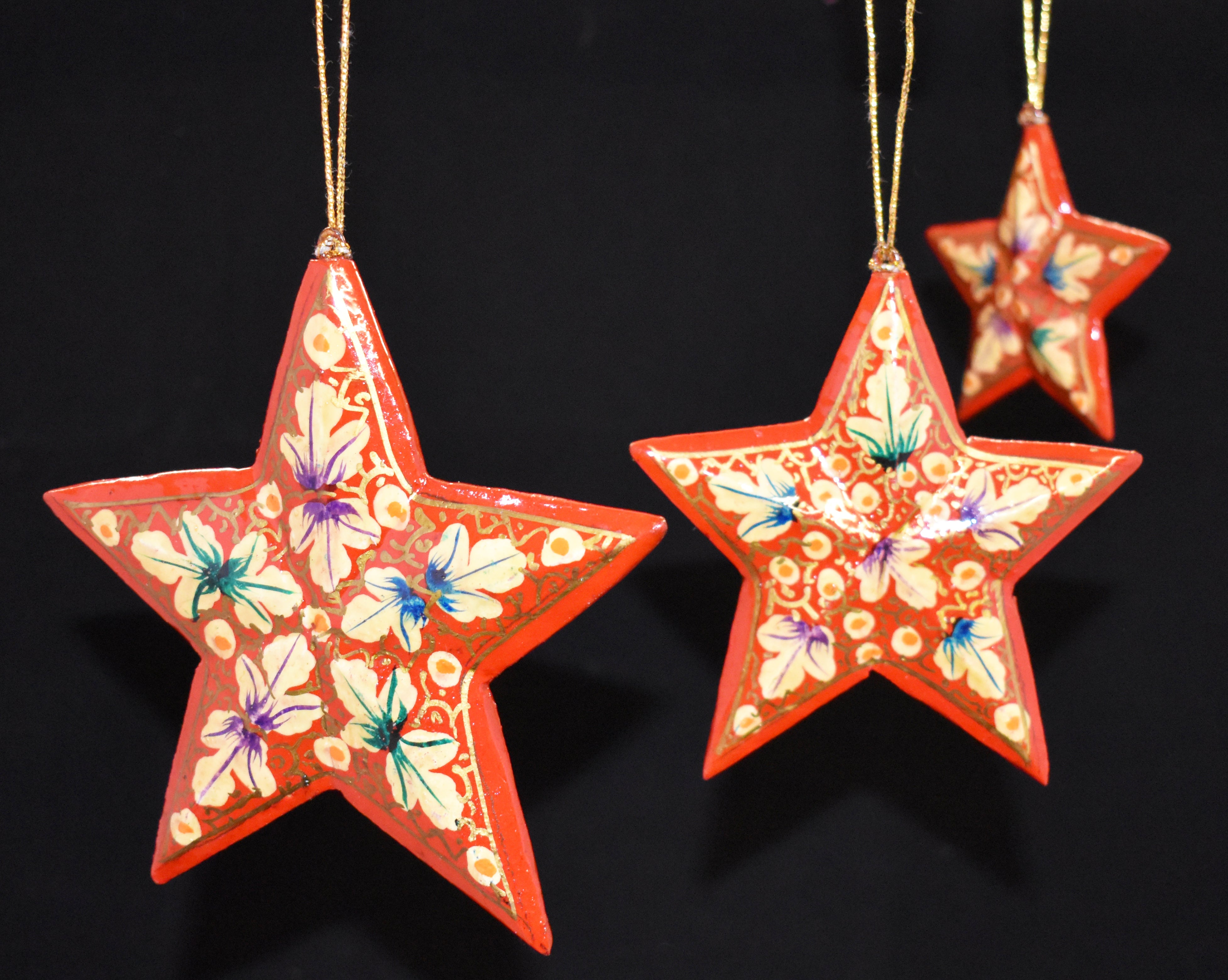 This set includes 3 stars. Whether you celebrate Christmas, just the festive season, or you just want to brighten up a room, these stunning hand painted stars will make a colourful statement. Each one is individually made from recycled paper, hand painted, vanished and finished off with a gold thread cord for hanging.  A stunning piece of fair trade and ethical recycled art! Hang on a tree, door handles, from mirrors, around picture frames or almost anywhere!