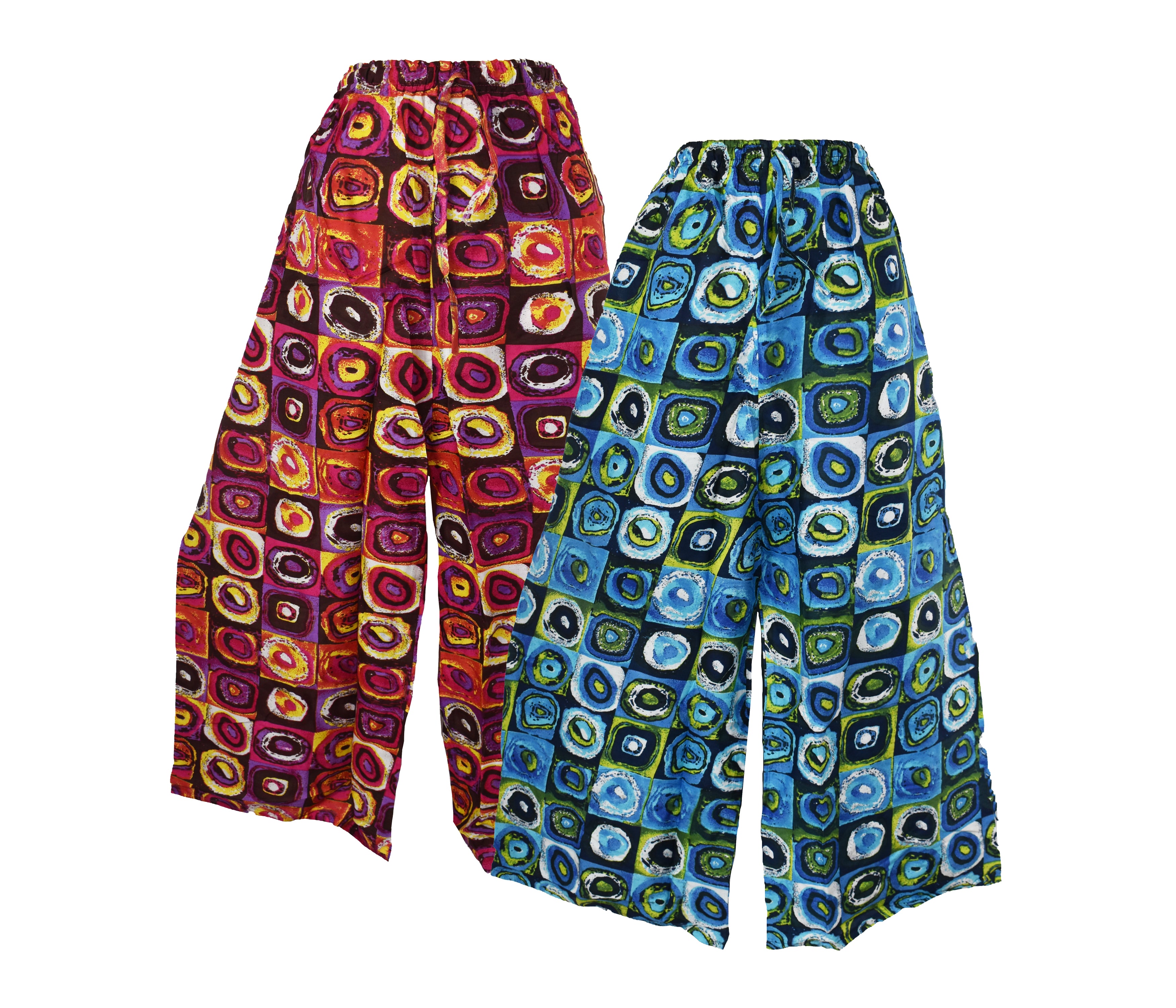 These circle print rayon trousers have an elasticated waist and draw cord. The legs are wide straight cut. Suggested best fit anyone size 8 - 16 depending on size. Would look great with a plain tee and summer sandals!