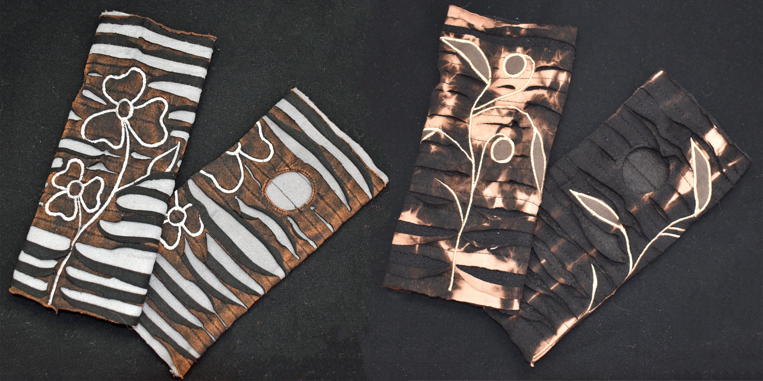 These beautiful wrist hand warmers are made from hand tie dyed cotton which has been razor cut and embroidered with a polyester fleece lined inside.  Designed to keep the hands warm whilst leaving the fingers free.  Slot hole for thumb.  Made to fit most adult hands, please check measurements against those below if unsure.  Machine washable on a cool, gentle, wool wash and line dry.