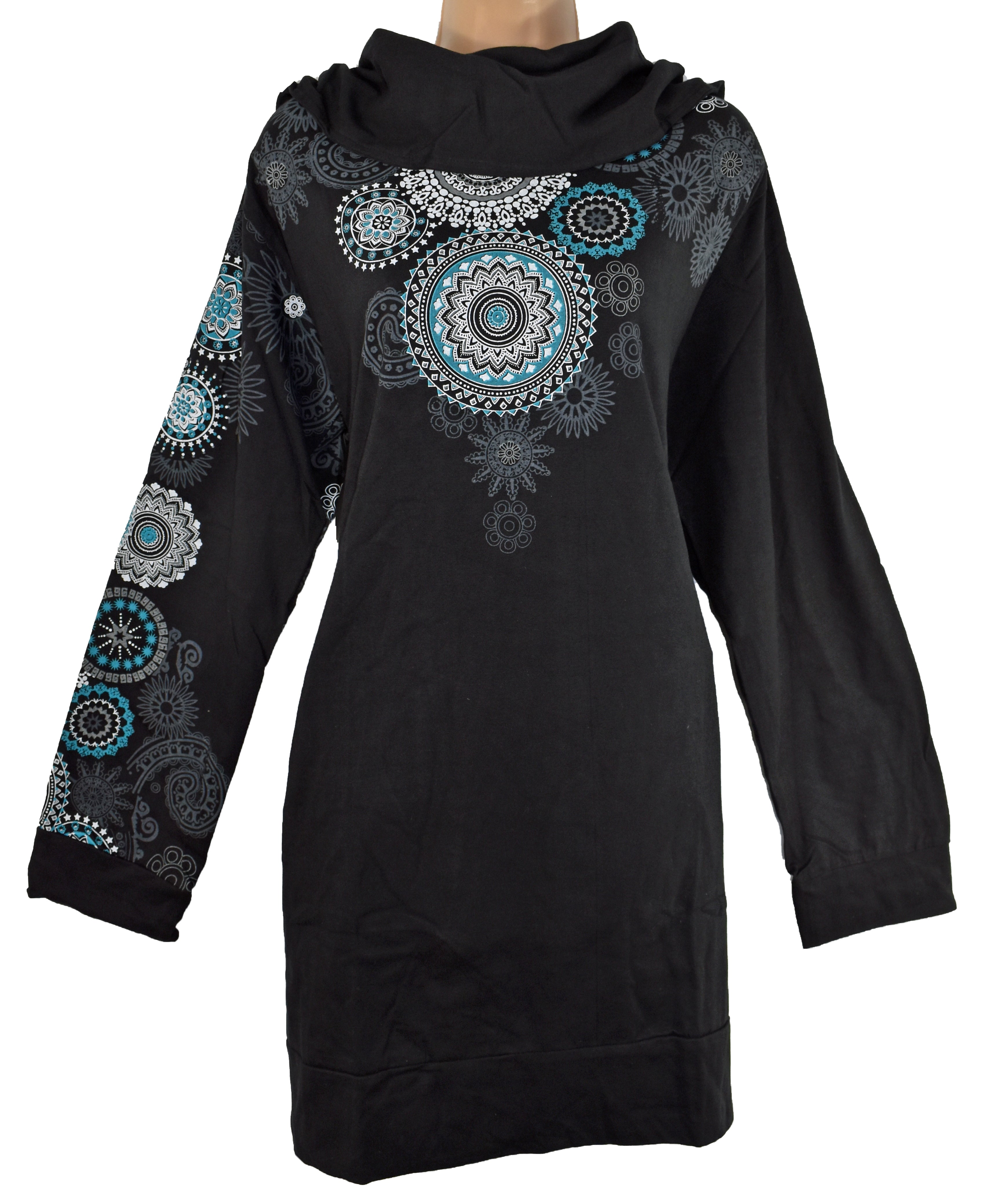This hooded top has printed mandala patterns on the front, back and sleeve with pockets on hips.  Could be worn as a top or as a jumper over another top.  Suggested for size 6 - 8 depending on your measurements.