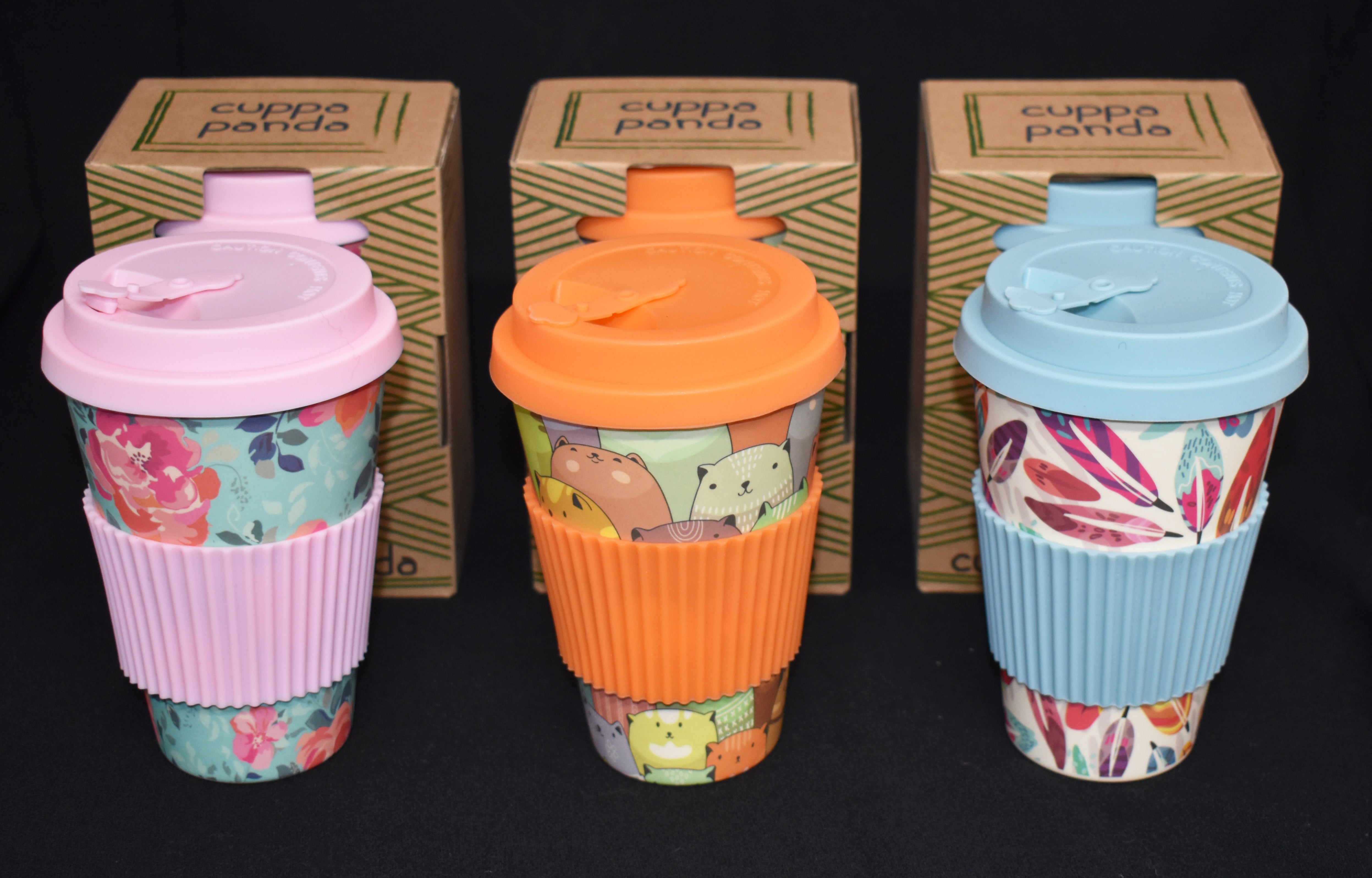 These eco friendly cups are made from bamboo fibre, corn flour and resin and are dishwater safe and fully biodegradable.  Each holds 400ml (14oz) and comes with a silicone lid and protection sleeve.  They measure 15cm tall.
