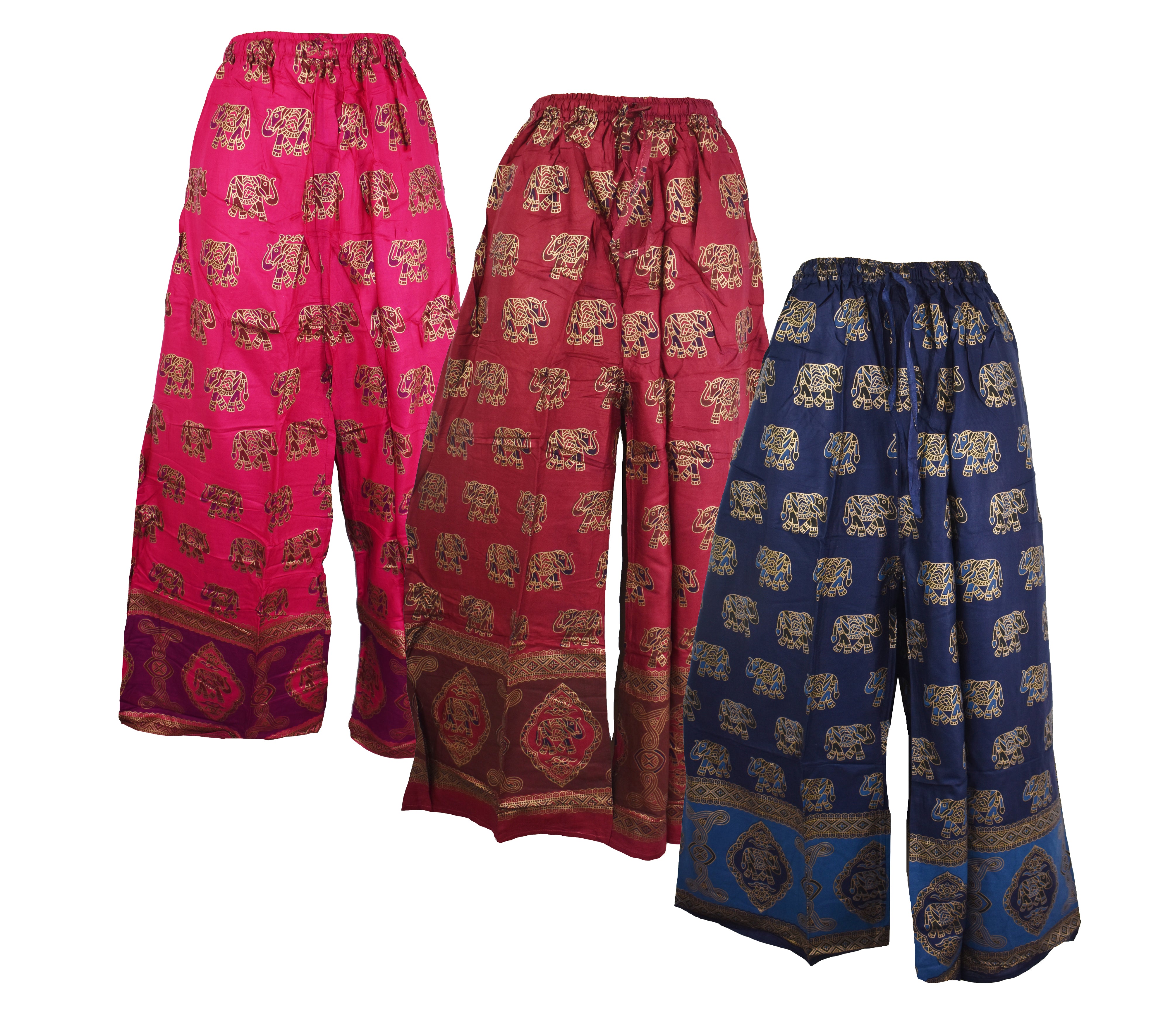 These trousers are made from gold printed rayon fabric with wide legs, full elasticated waist and draw cord. The gold print is hand block printed in an elephant pattern. These trousers come in one size suggested for 8 - 12/14.