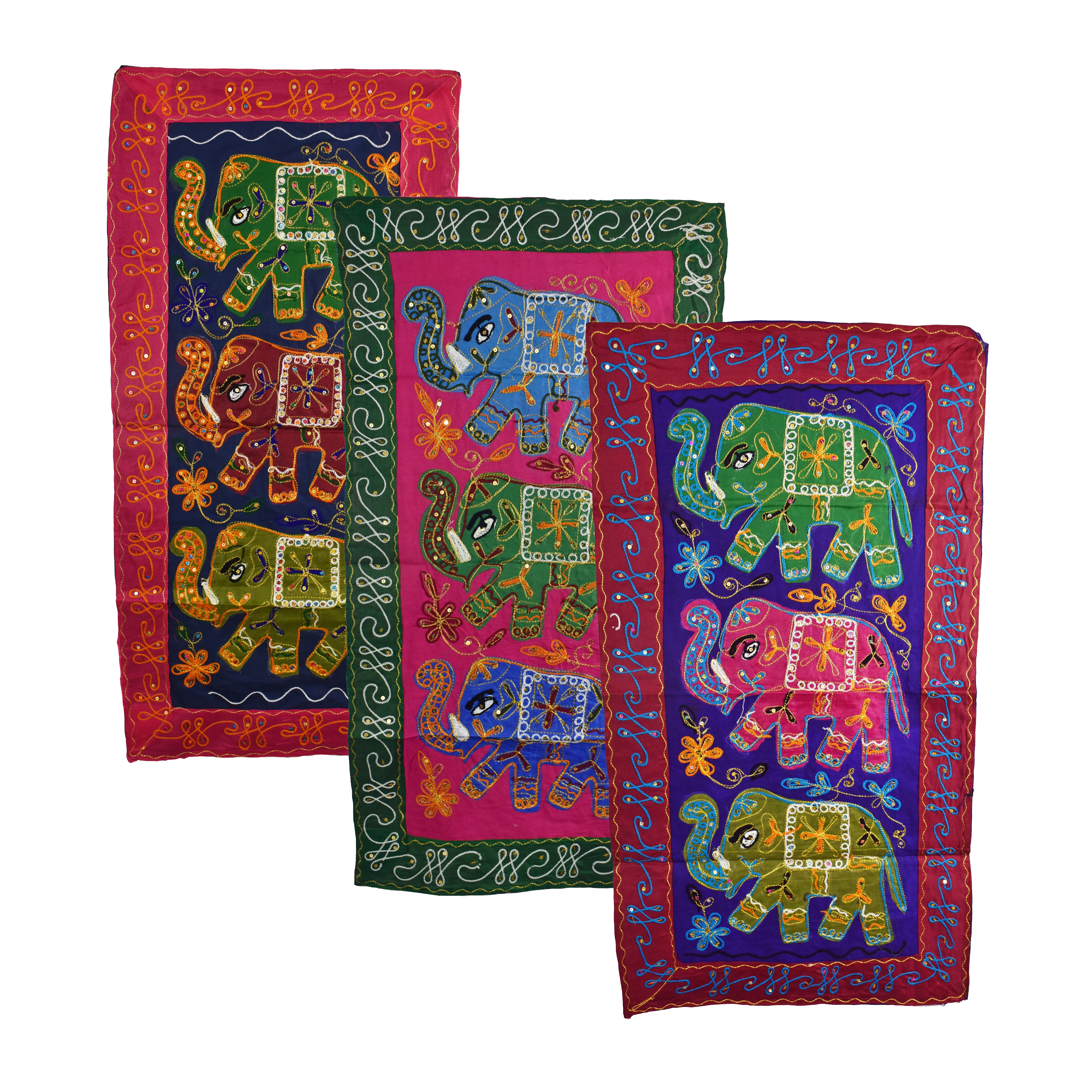These hand-embroidered hangings are miniature masterpieces – each one a unique creation, yet united by the same intricate design. Our talented seamstresses meticulously sketch the pattern onto each piece before delicately stitching with luxurious gold thread and shimmering sequins, all by hand. Whether draped on a wall or styled as a stunning table runner, these pieces add a touch of opulent Indian craftsmanship to any home, van, or space – infusing it with rich ethnic flair!