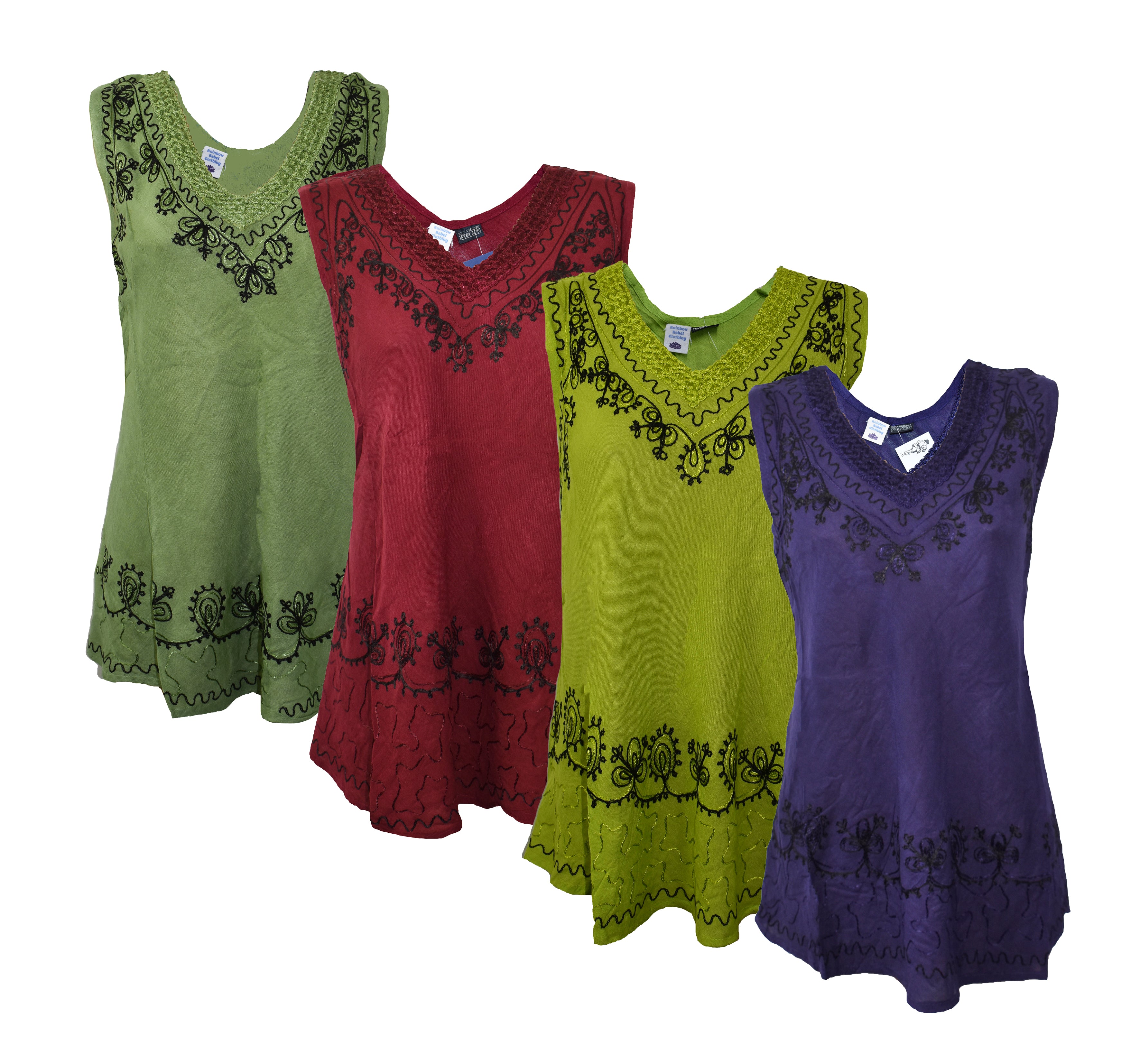 These vest tops are made from floaty viscose fabric with embroidery on the collar and hem. Sleeveless they have a wide shoulder. The fabric is wider lower down like an umbrella dress meaning to hangs without clinging around the waist. Available in free size they are cut on the bias so stretch suggested best fit a size 12- 16. The model is a 16/18. Available in 7 colours. Great in Summer with bare arms or in cooler weather with a cardigan, shrug or shawl. Great with leggings or jeans.