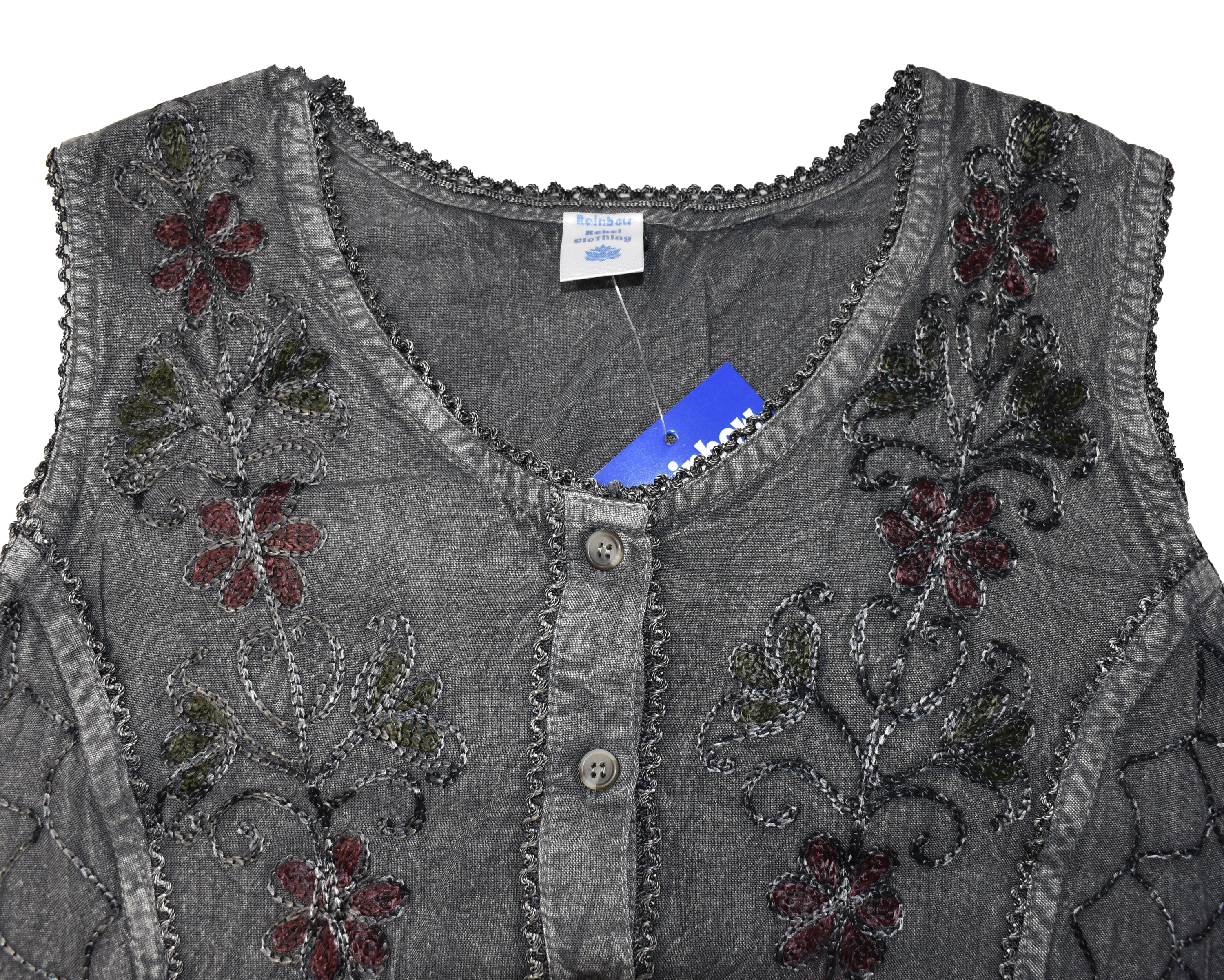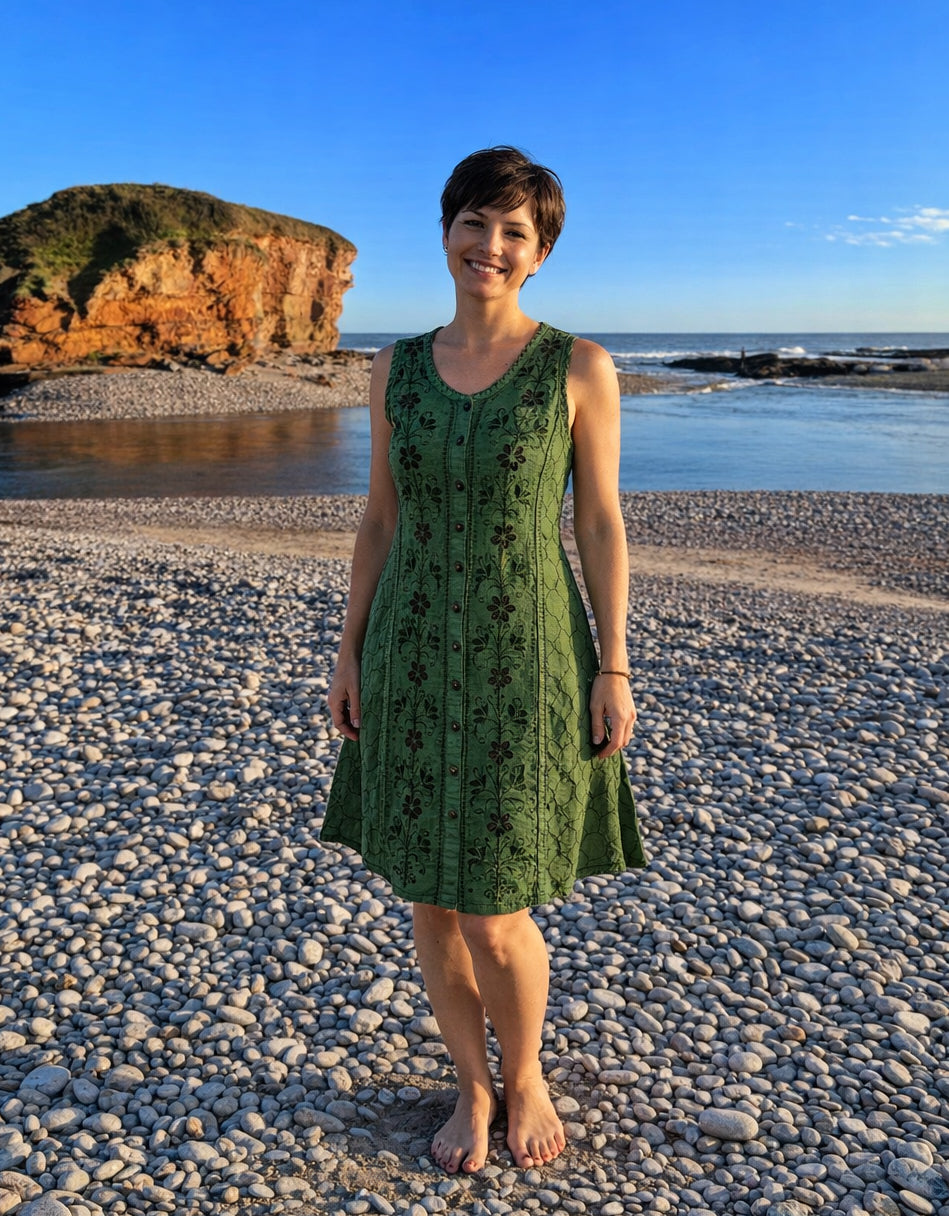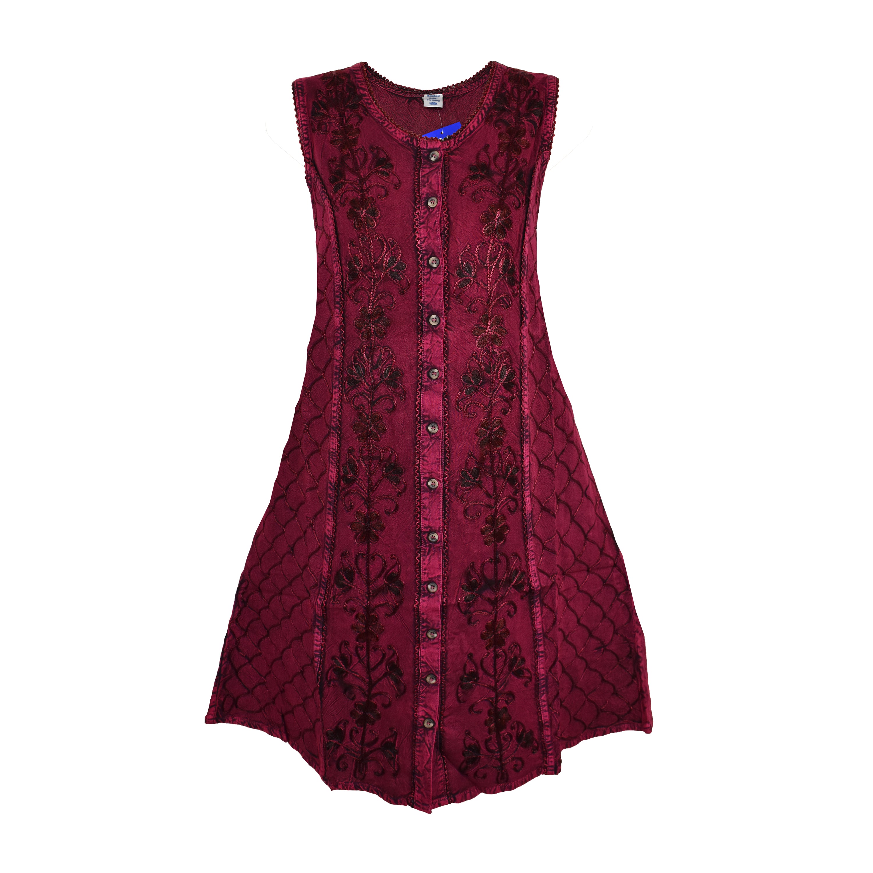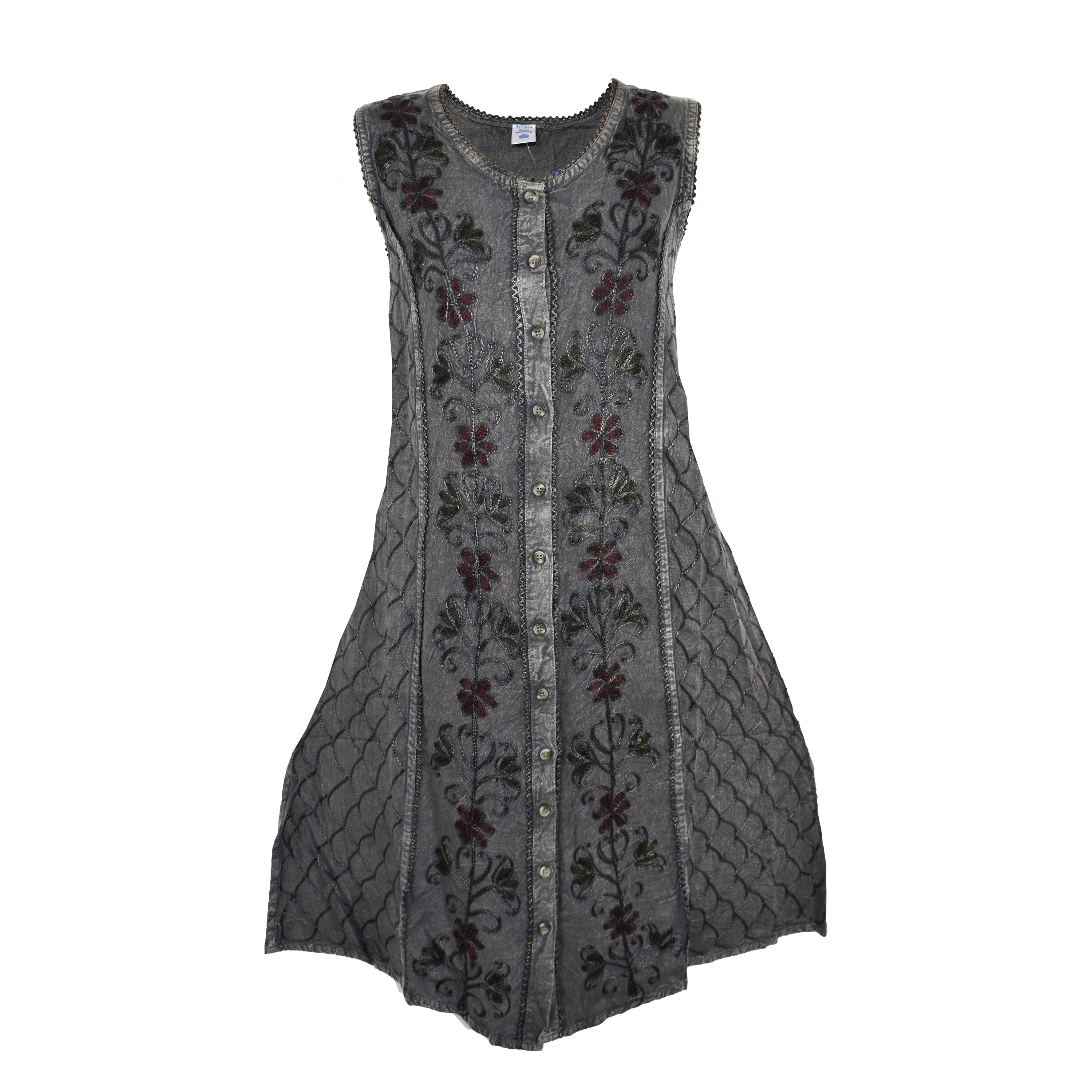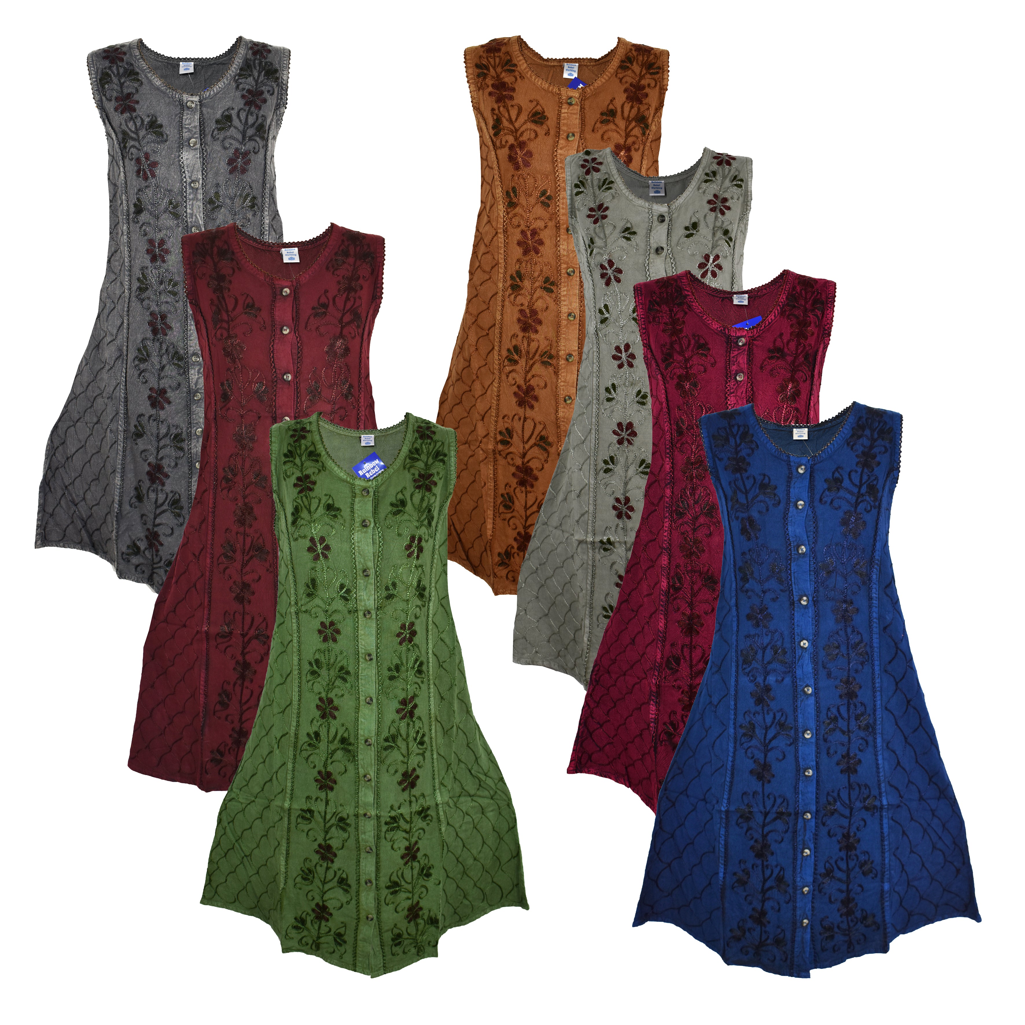 These stunning stonewashed viscose dresses have a button down front and ties at the back for a fitted look if wanted. The front has embroidered flower patterns and it is around knee length. Available in one size only and seven colours suggested best fit 12, 14 or small 16 depending on chest size.