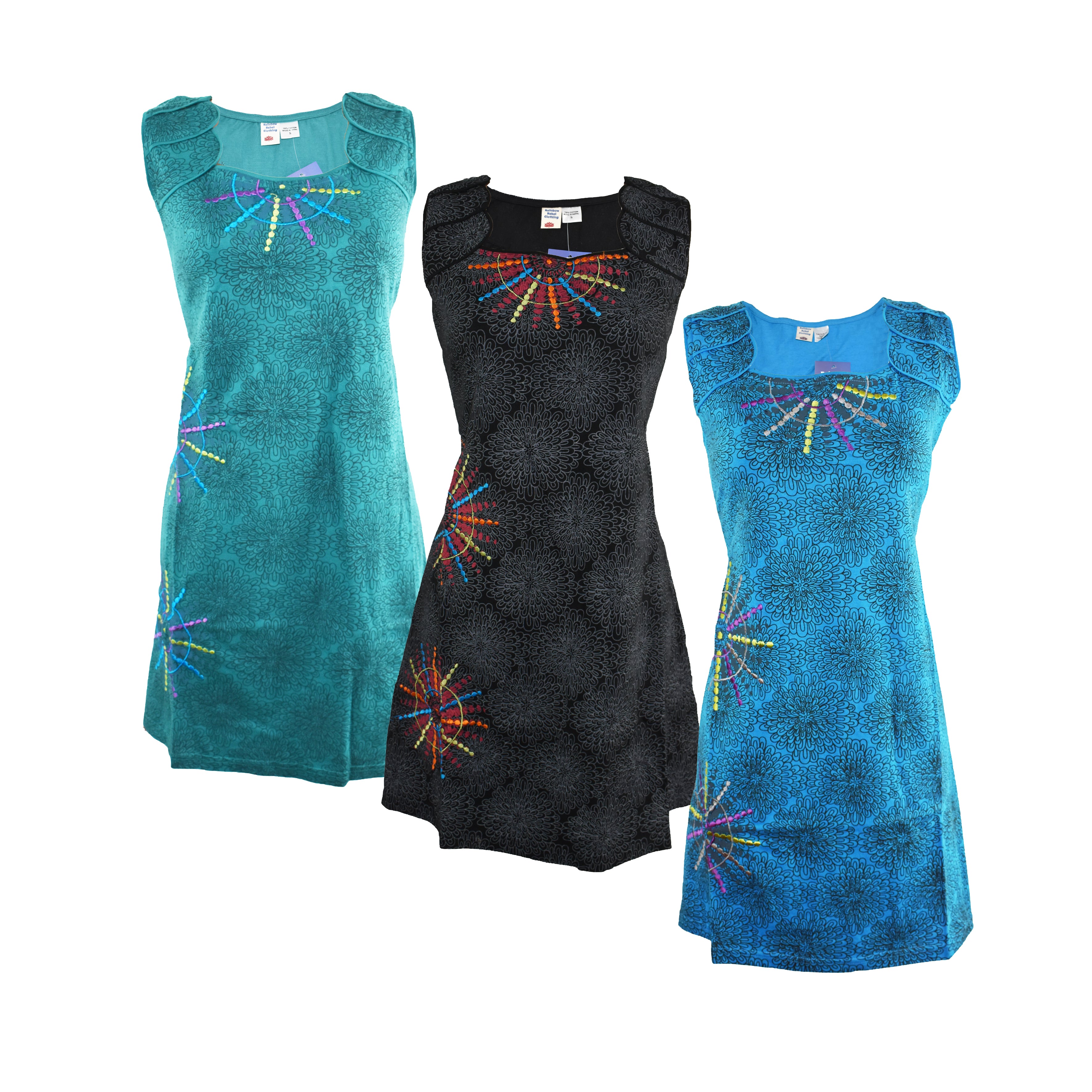 Step into style with these stunning dresses, crafted from soft printed cotton with intricate floral embroidery on the front. The wide shoulders are perfect for covering bra straps, while the delicate petal-shaped detail adds an extra touch of elegance. Around knee length depending on your height.