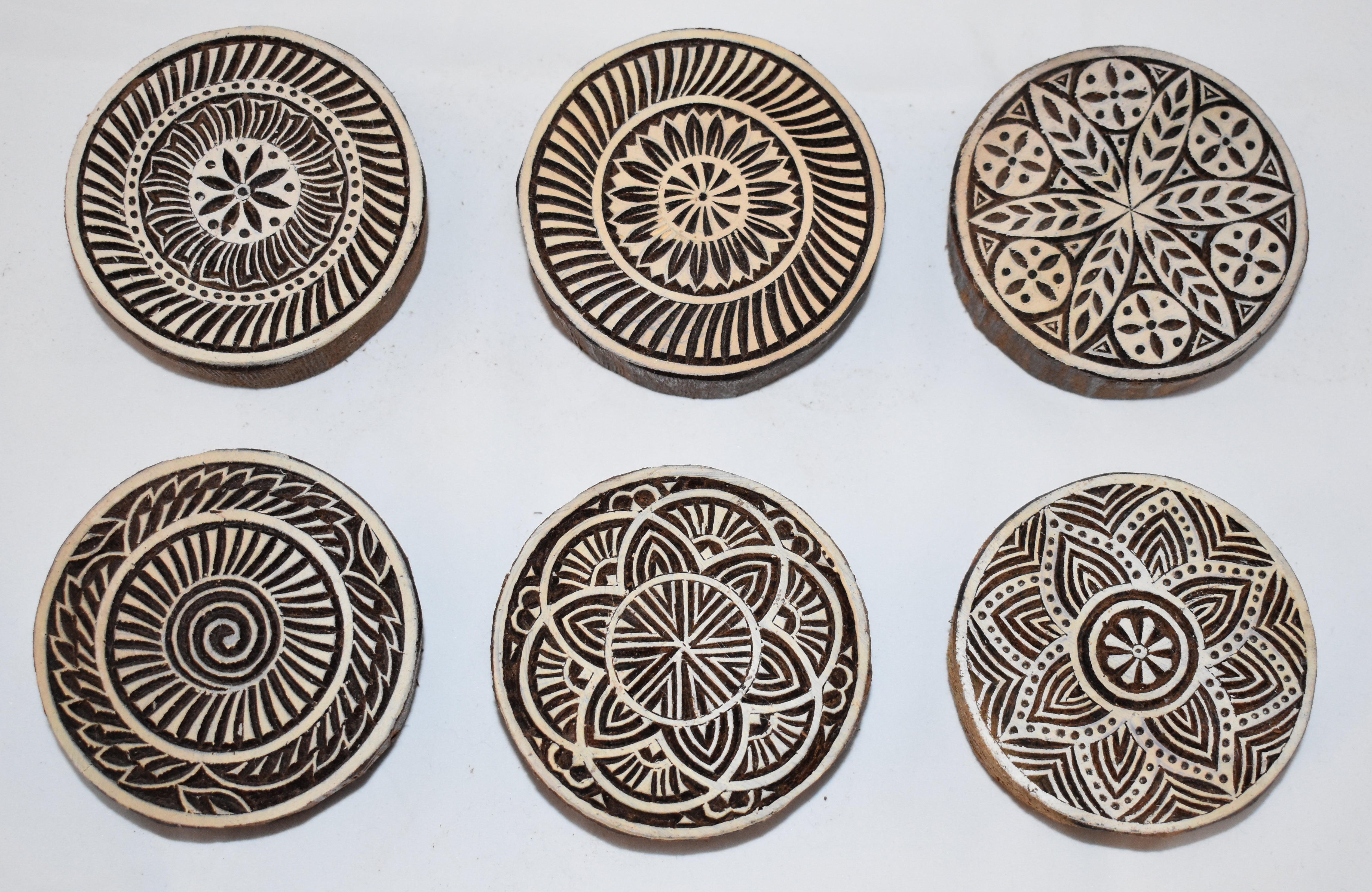 All our woodblocks are made on a fair trade basis from sustainable Sheesham wood by our supplier Gurmakh and his family in India.  Each is hard carved. The men do the carving by making a design in metal wire, heating it and then stamping it onto the raw blocks.  The scorched marks are then used as a template for hand carving the design.  Next the women soak the blocks in linseed oil, dry them and finish them with a gesso white paint on the printing surface to give a hard and durable yet smooth finish for printing.  Often the natural wood oils change the gesso colour to light brown.  The blocks are cut deep enough for printing onto fabric and paper. Great used with acrylic and fabric paints or printing ink.  Those with an advanced skill can also print with henna onto skin or press into clay.  However they can also just be used as a decorative piece of art for the home!