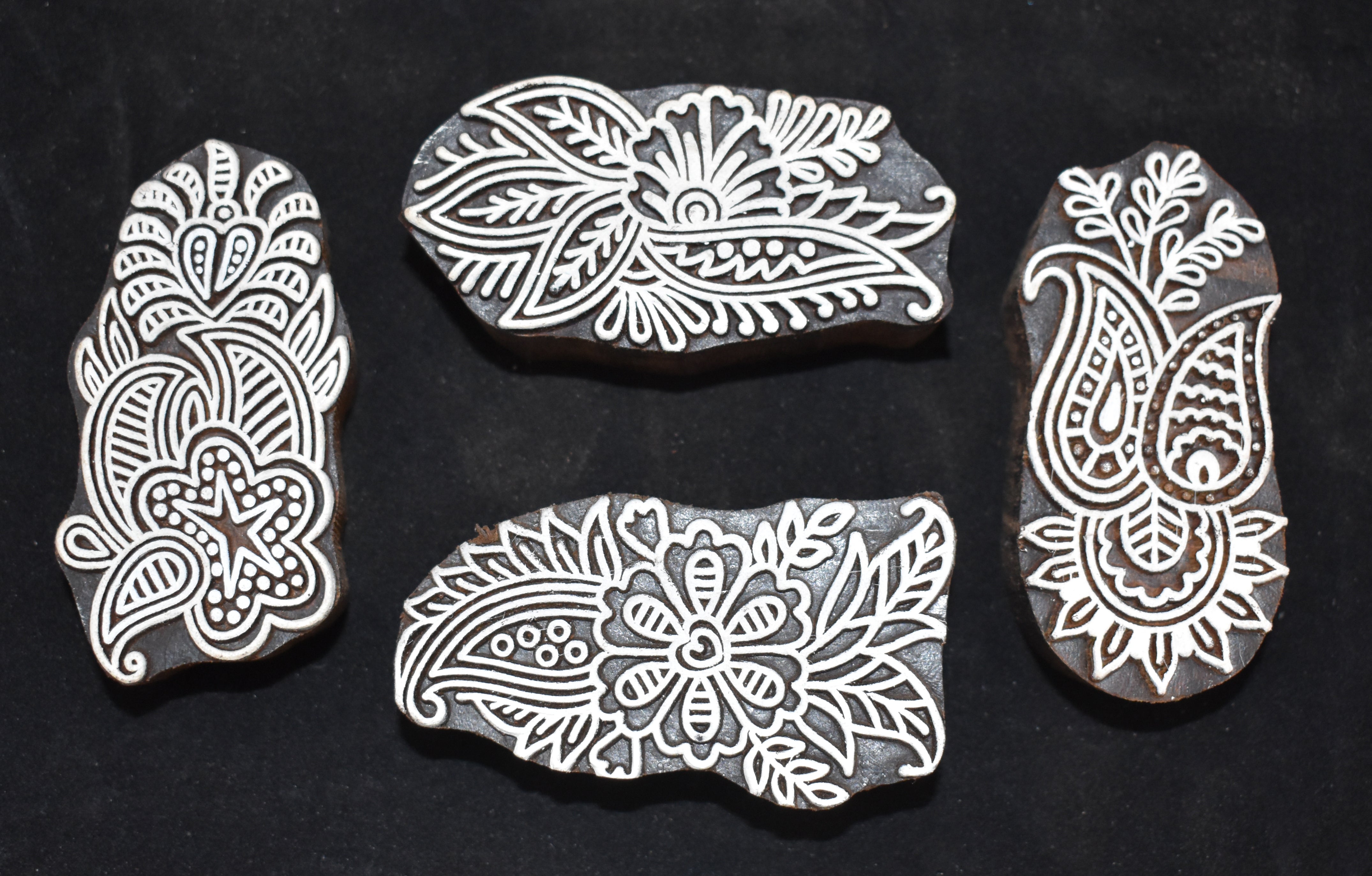All our woodblocks are made on a fair trade basis from sustainable Sheesham wood by our supplier Gurmakh and his family in India.  Each is a mix of hand and machine carved so unique. The men do the carving by making a design in metal wire, heating it and then stamping it onto the raw blocks.  The scorched marks are then used as a template for hand & machine carve the design.  Next the women soak the blocks in linseed oil, dry them and finish them with a gesso white paint on the printing surface to give a hard and durable yet smooth finish for printing.  Often the natural wood oils change the gesso colour to light brown.  The blocks are cut deep enough for printing onto fabric and paper. Great used with acrylic and fabric paints or printing ink.  Those with an advanced skill can also print with henna onto skin or press into clay.  However they can also just be used as a decorative piece of art for the home!