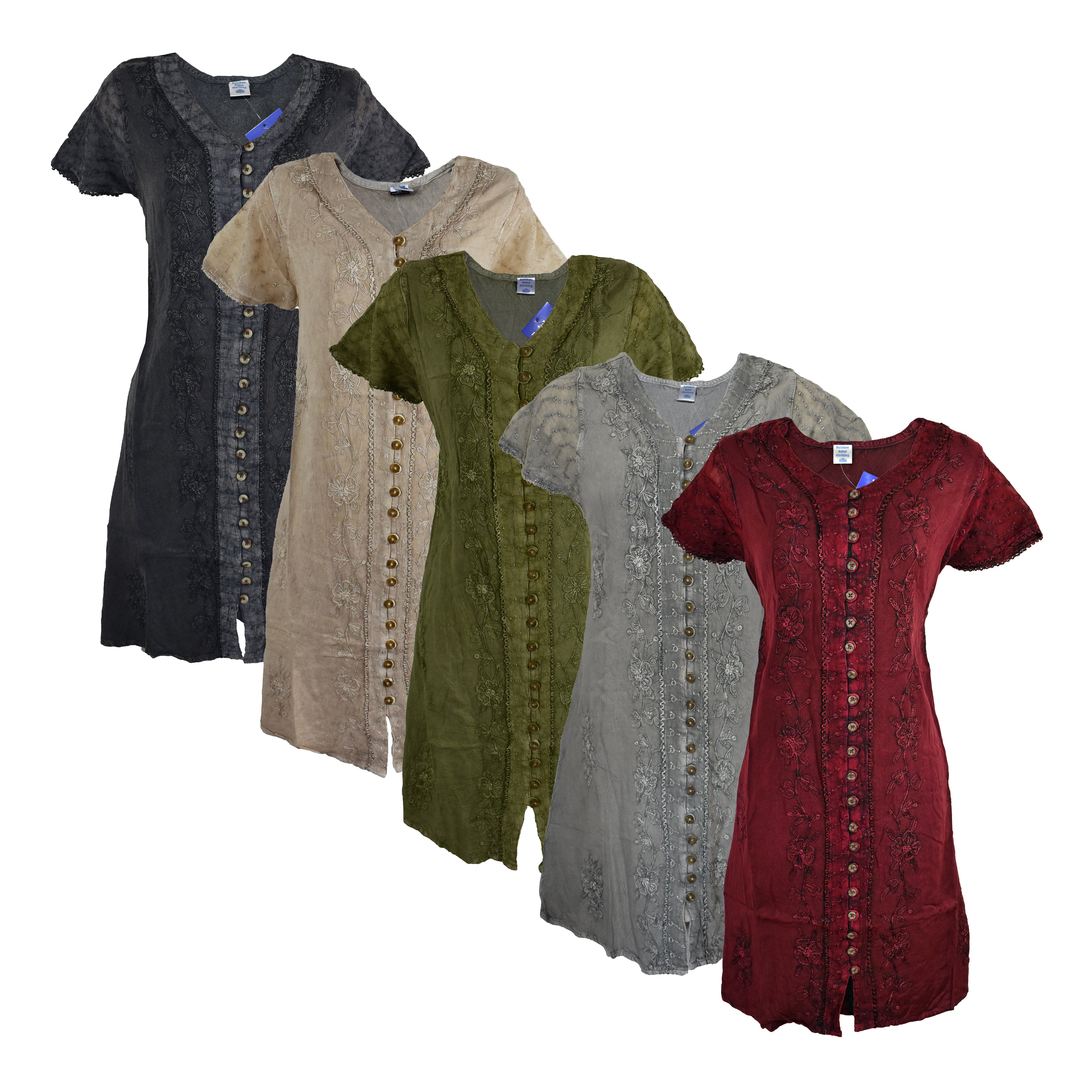 Made from soft viscose, these dresses feature delicate embroidered floral designs on the front and pretty lace-trimmed capped sleeves. The front buttons add a touch of detail, while the back ties allow you to adjust the fit for a more flattering shape.