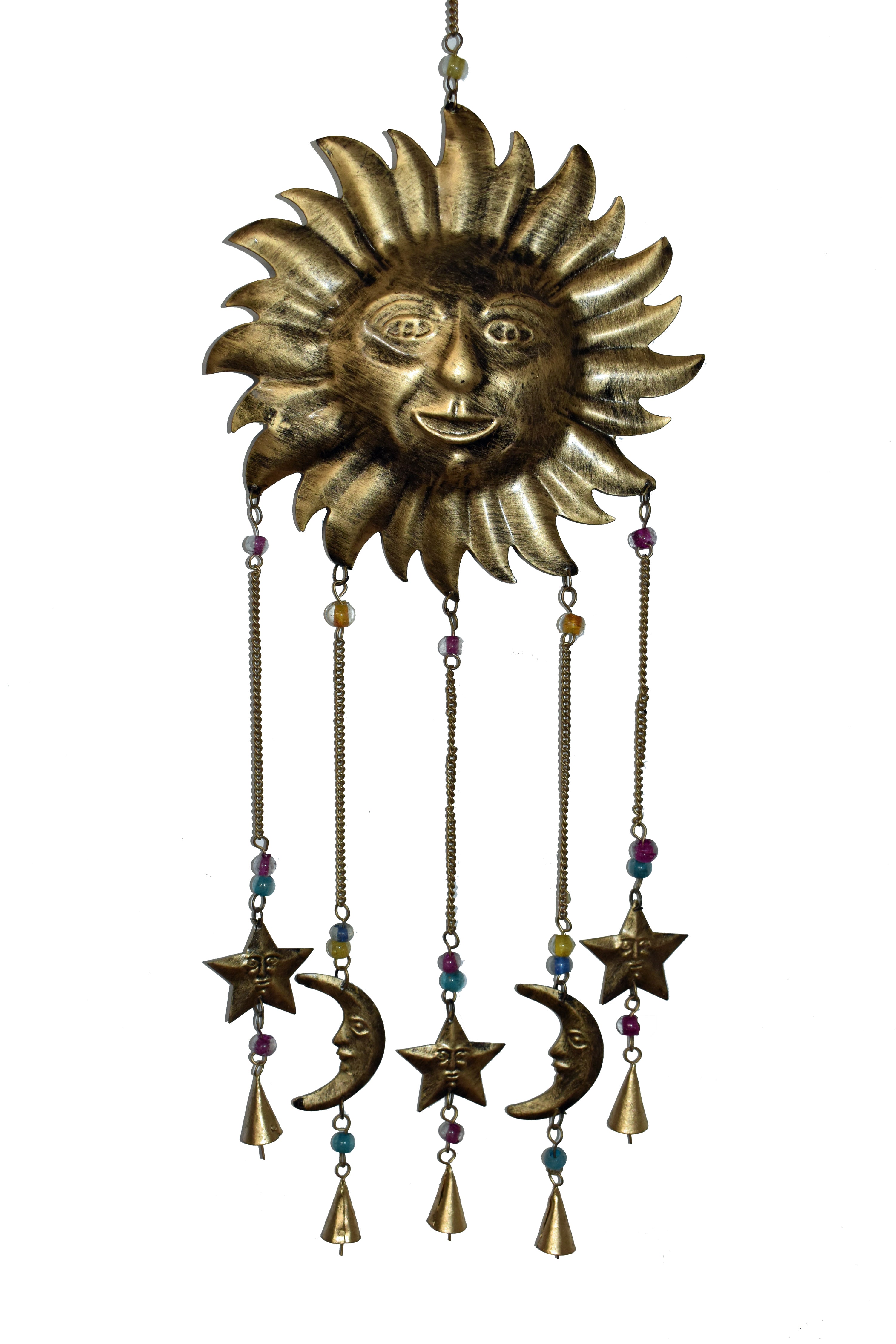 Crafted from recycled metal and hand finished with rustic gold colour, each piece is full of character. Hung from a chain, with four lower hanging sun and moons, these versatile decorations work beautifully as a wind chime or simply as a striking decorative feature.