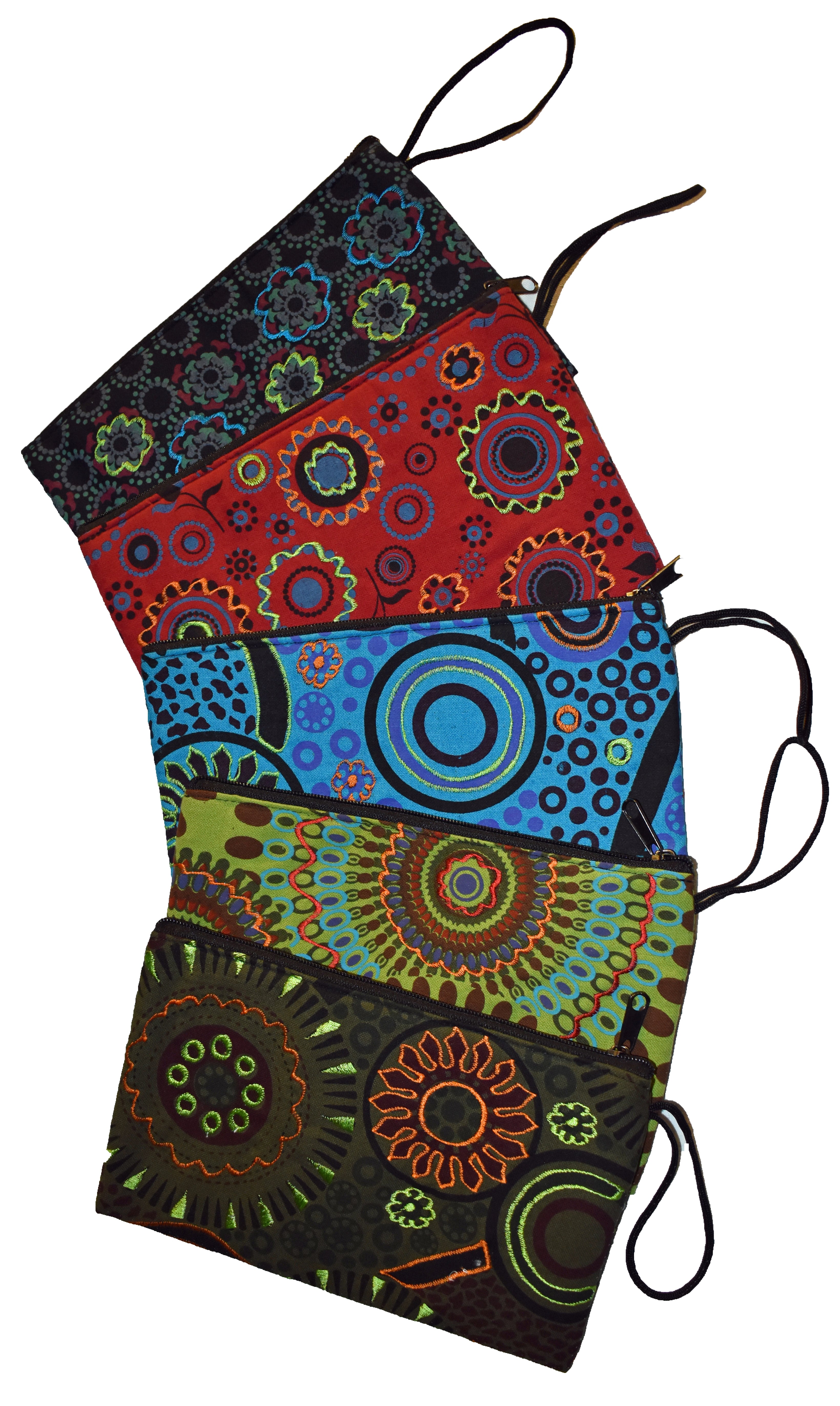 These beautiful purses have been made on a Fair Trade basis, in Nepal, from printed and embroidered cotton.  Fully lined in black cotton with light padding, each closes with a zip and has a loop for attaching keys or to attach to a bag.  Can be used as a large purse, make up or jewellery bag or a pencil case.  Machine washable.