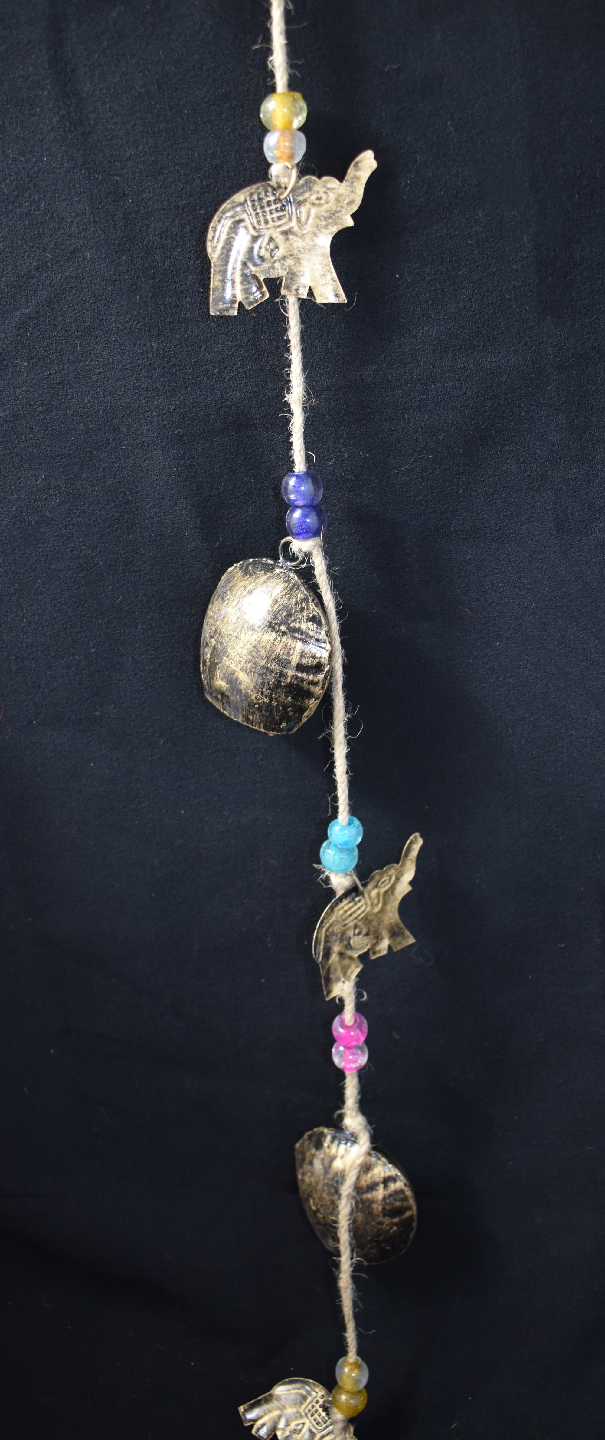 Bring a touch of peace and charm to your space with our long hanging bell and elephant string! Crafted from recycled metal and hand painted gold colour, each piece is full of character. Hung from a jute twine cord, with hanging glass beads and bells, these versatile decorations work beautifully as a wind chime or simply as a striking decorative feature in a house or garden.