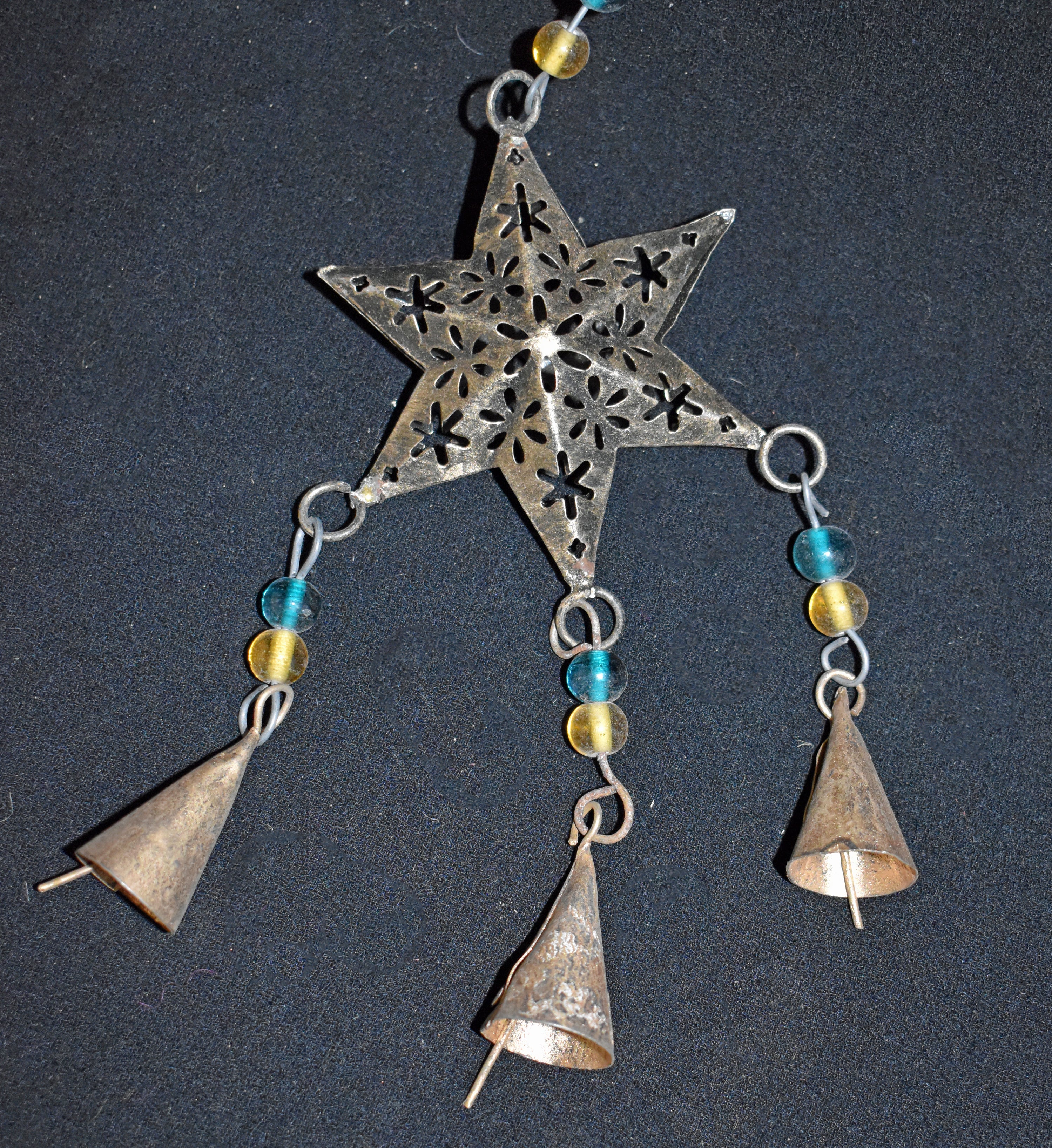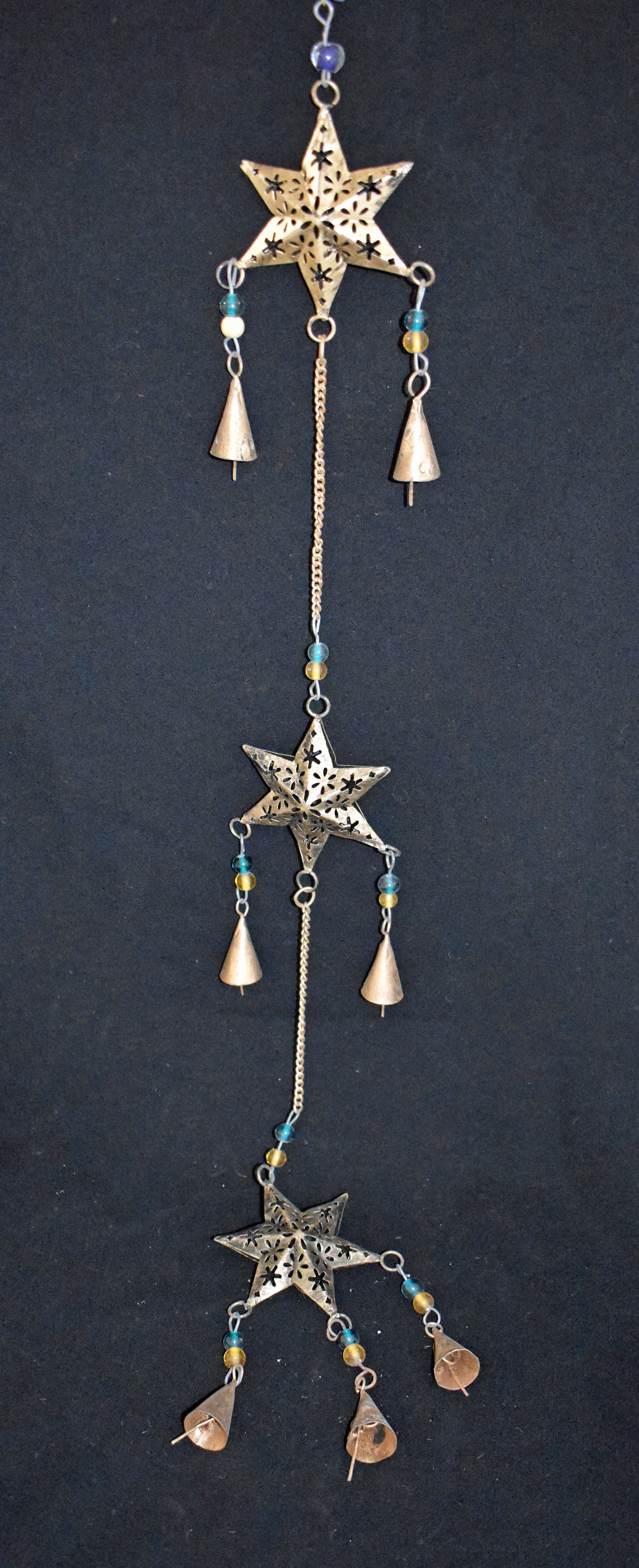 Bring a touch of peace and charm to your space with our long three hanging gold tone stars! Crafted from recycled metal and hand painted gold colour, each piece is full of character. Hung from a chain, with three lower hanging glass beads and bells, these versatile decorations work beautifully as a wind chime or simply as a striking decorative feature in a house or garden.