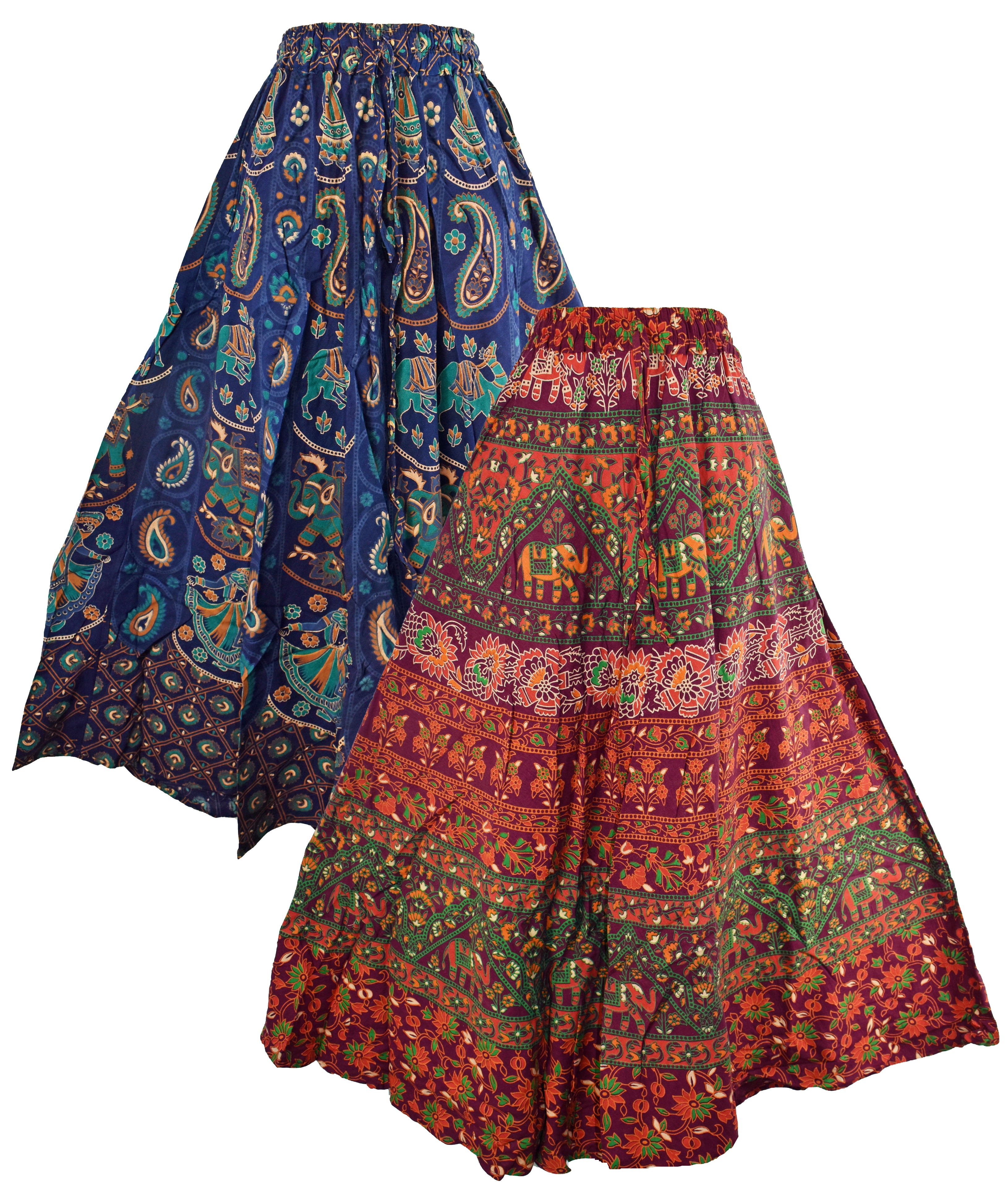 This skirt is made from Indian "bedspread" cotton so is a good mid weight, which has then been printed with animal and paisley motifs. The waist is elasticated and there is a draw cord. Skirt s around ankle length depending on your height. Suggested fit a size 6 - 10 depending on your measurements