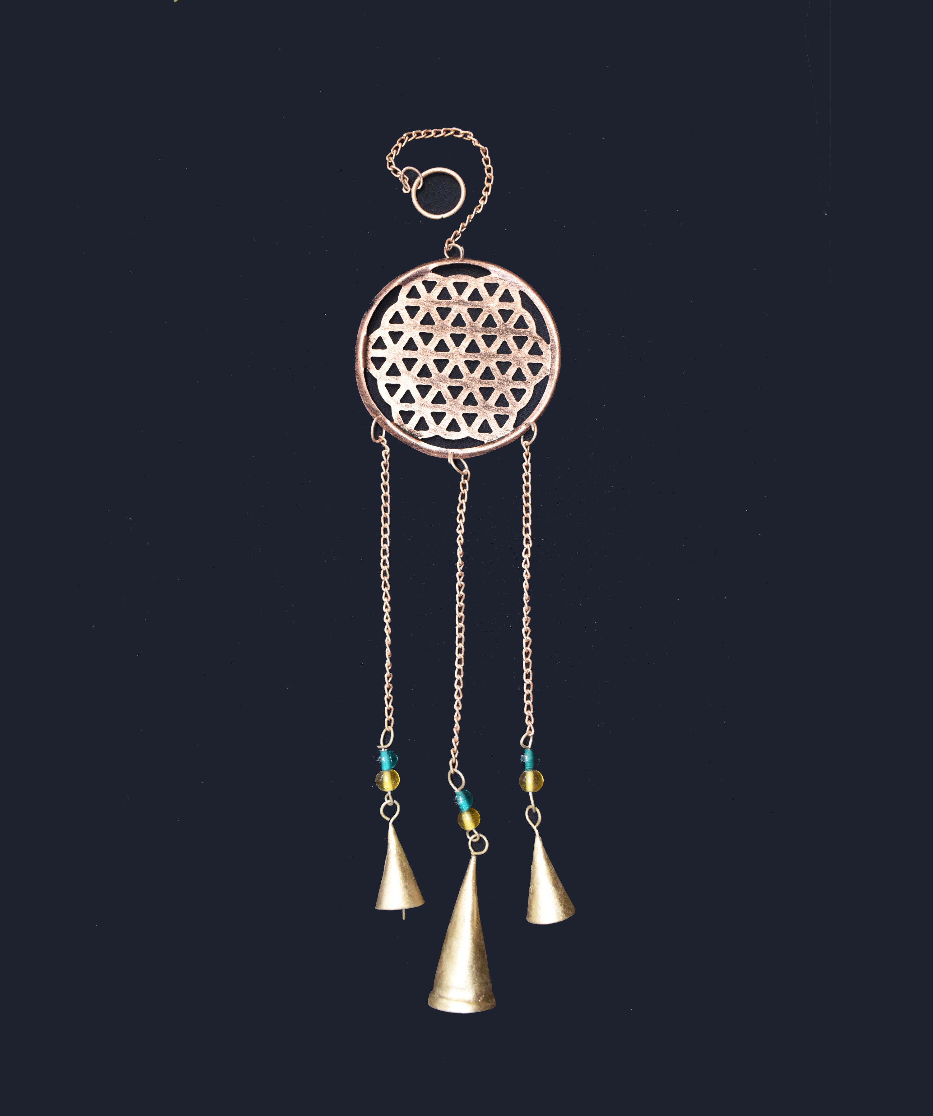These metal hanging are made from recycled painted aluminium and a gold coloured metal alloy.  Each has three chains which all end in glass beads and working cone bells.  Ideally used as an wind chime, door chime or just decorative wall art.  Each measures around 50cm from top of hanging chain to bottom of large bell.  The circle of life is 10cm in diameter.