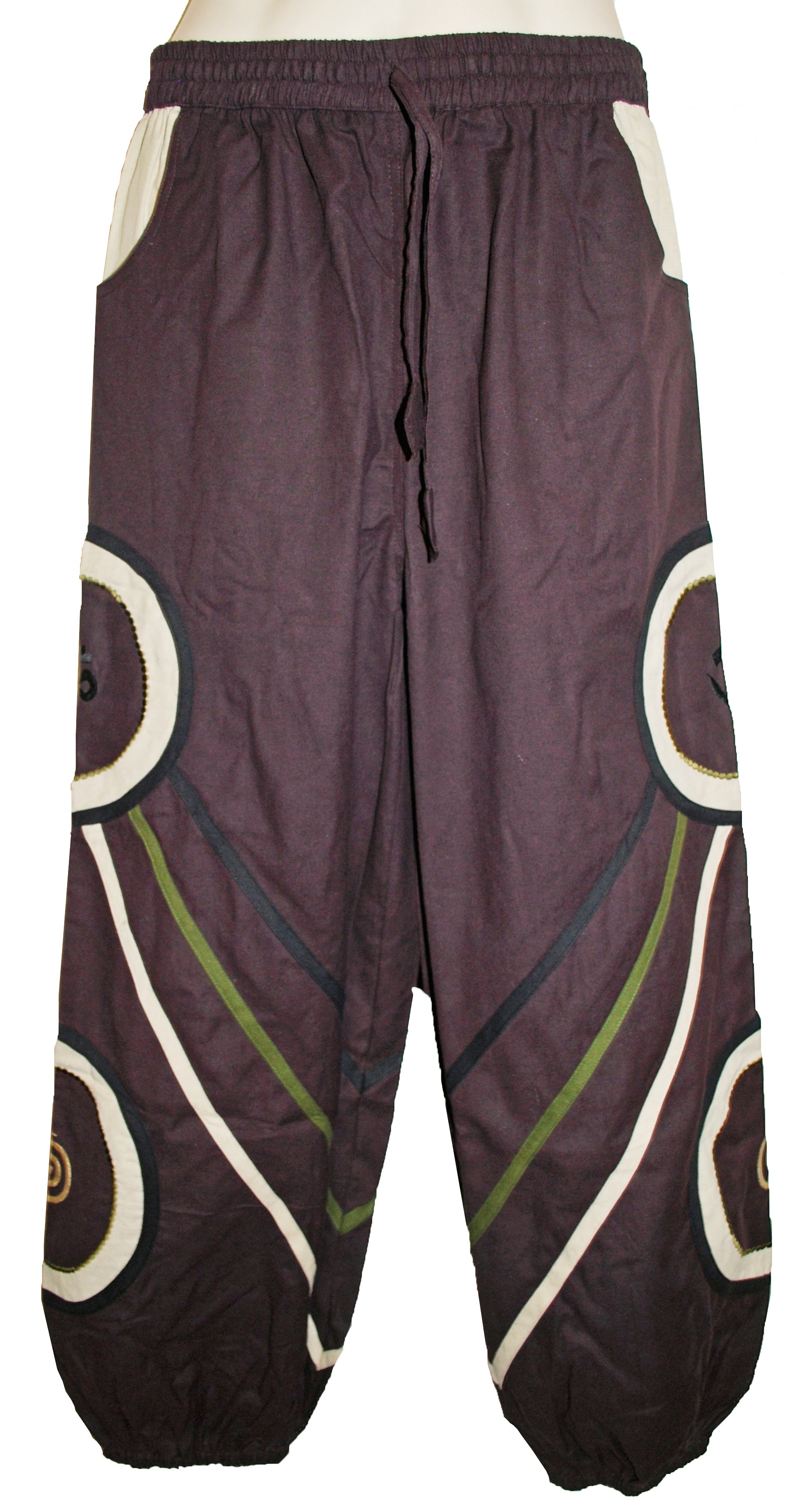 These trousers have been made from mid weight cotton with an elasticated waist and ankles.  Pockets on the waist at both sides are in contrasting colour cotton.  Down the sides of both legs are embroidered Om patterns and stripes.  These look great with a plain t-shirt.  Available in two sizes.