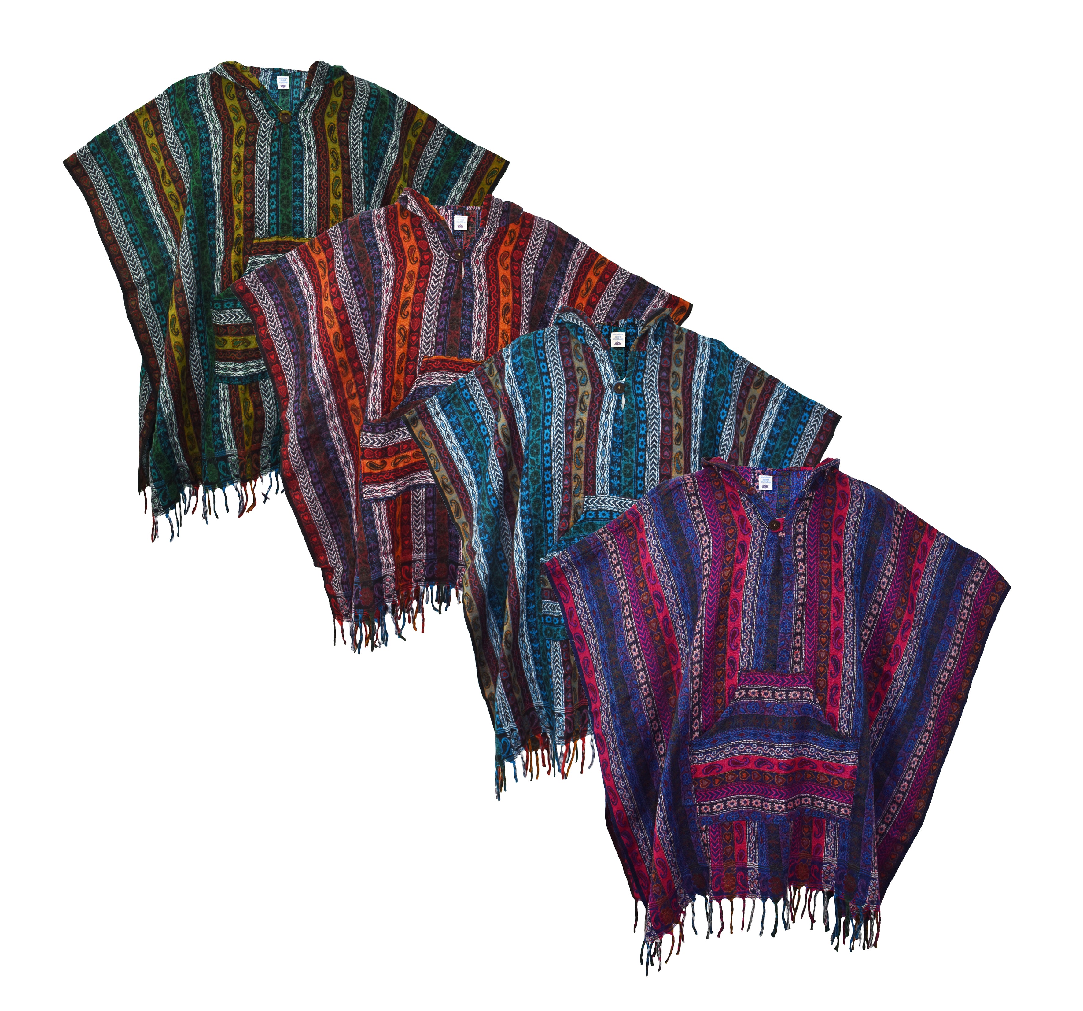 Our fleece ponchos are square cut with a front pouch pocket and a round hood. They come in free size and available in four colours blue, green, purple and red/autumnal tones.