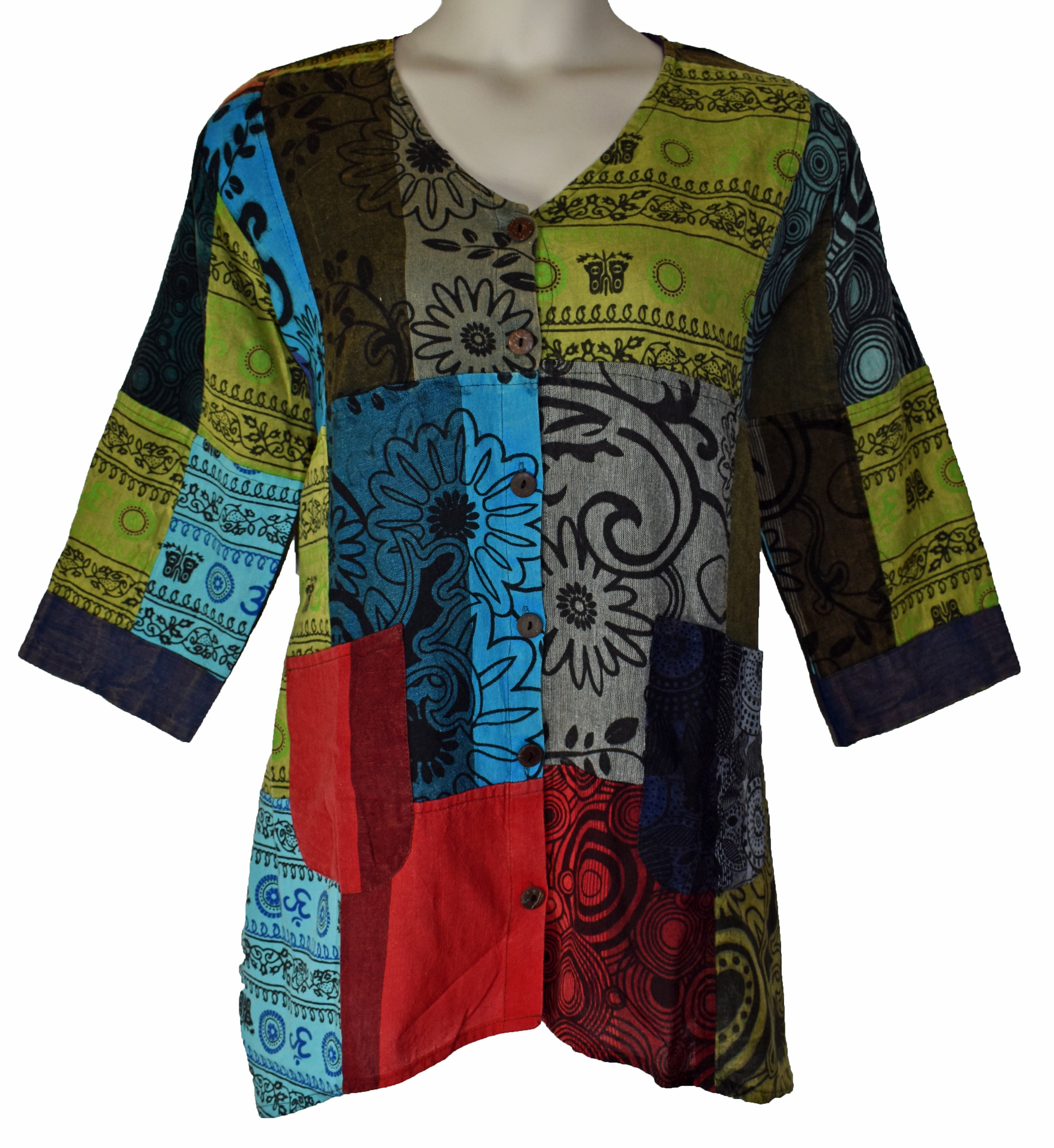 These beautiful blouse tops have been made by Fair Trade company Gringo from stonewashed printed cotton.  Front pockets and coconut buttons mean this can be worn open like an over shirt or done up as a blouse!  Great with leggings or jeans! Suggested best fit a sizes 24 - 26 depending on chest size!  Each top has same colours, print and patches but placement may vary to photos.