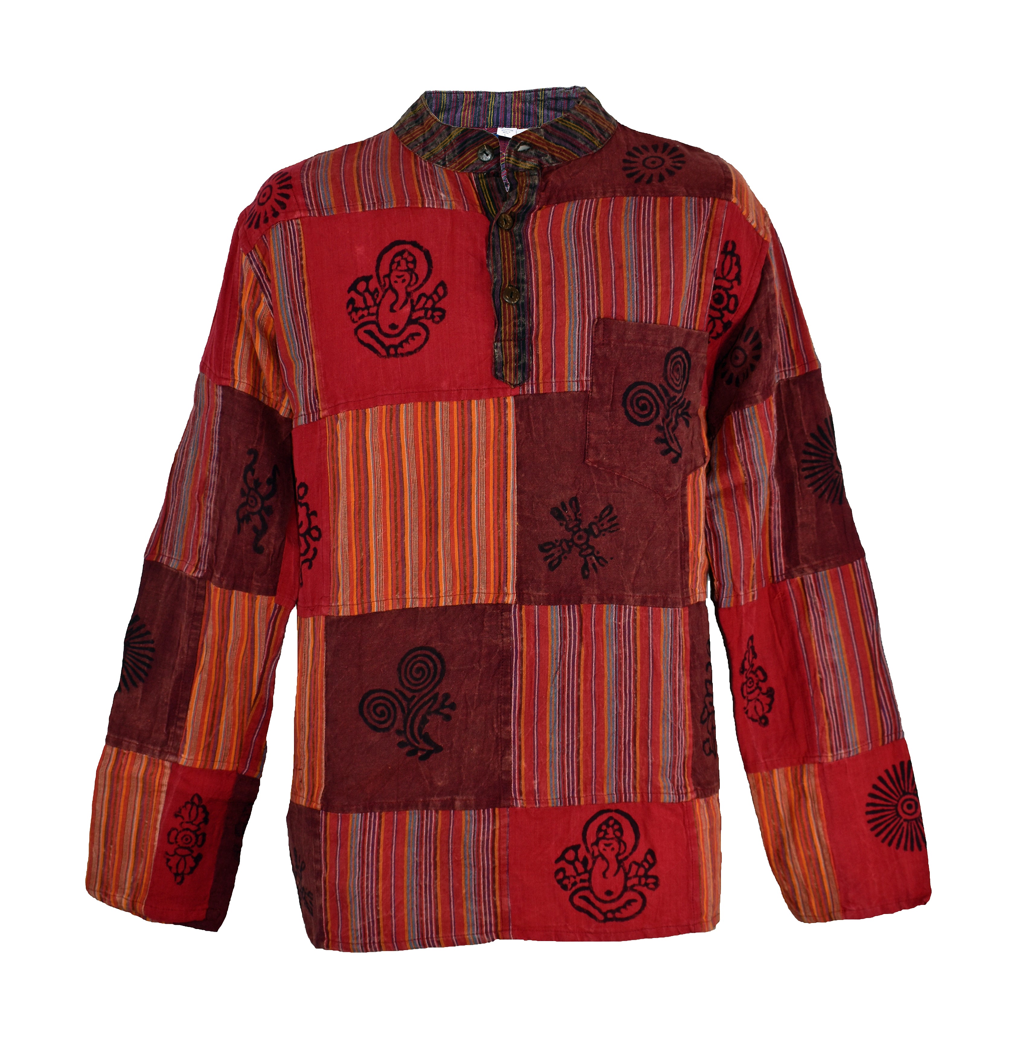 These shirts are fair trade from Nepal from patches of cotton which have been overdyed and hand block printed with wooden stamps of traditional Nepalese and Tibetan images including auspicious eyes, Tibetan Knots, Om and lotus flower motifs.  Available in 4 sizes..  Each shirt is made of similar colour patches but location and print may vary to photos.