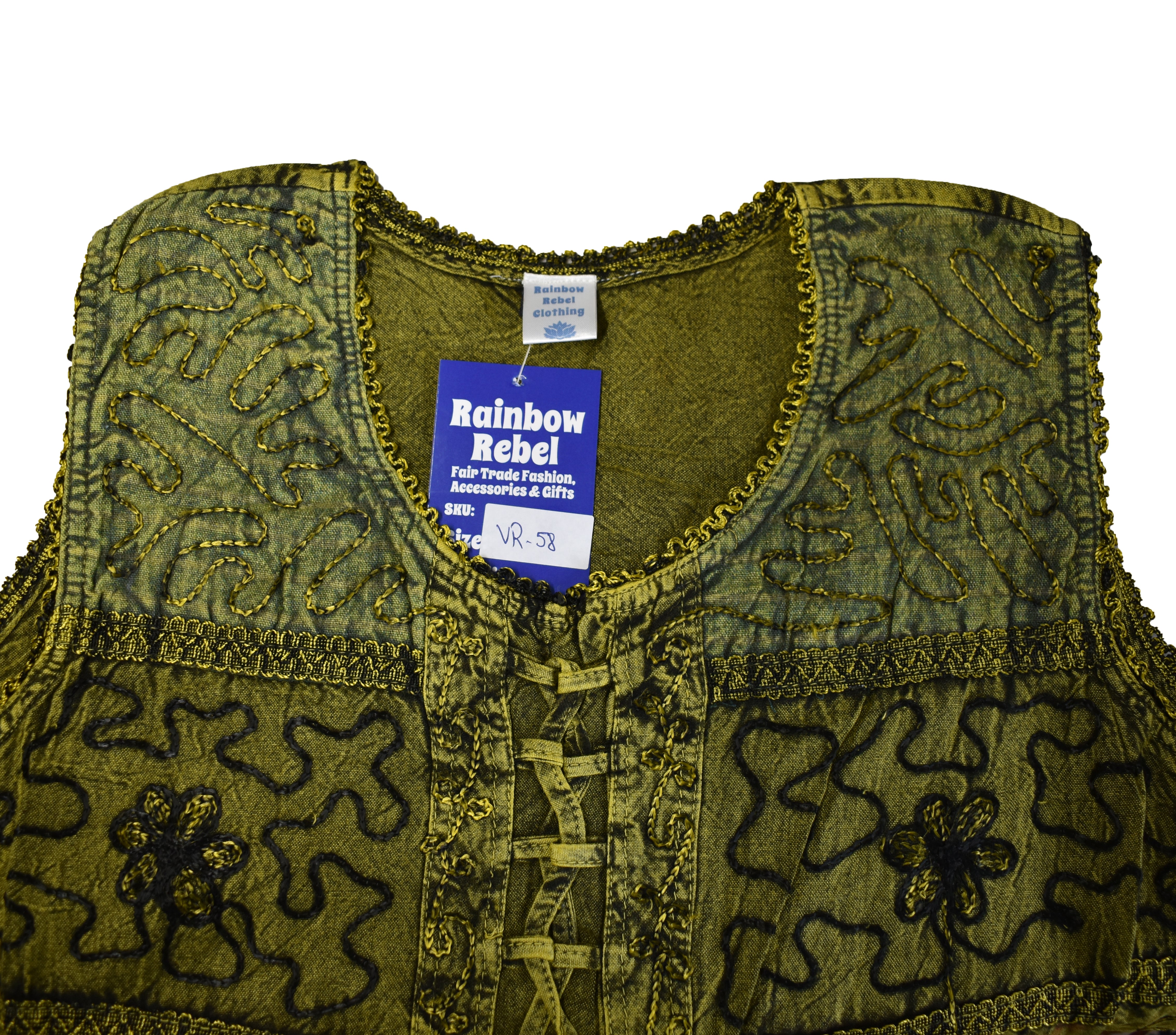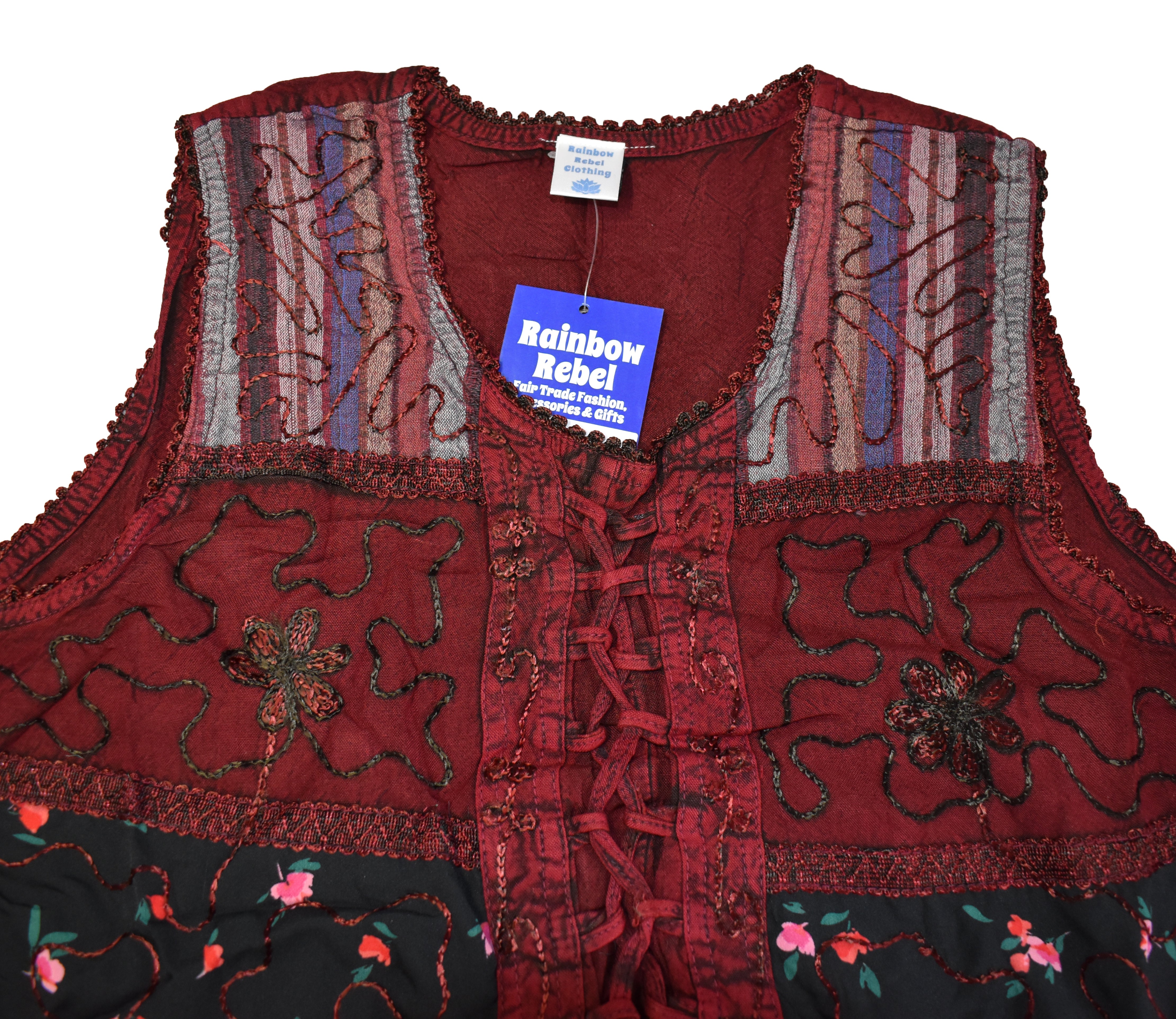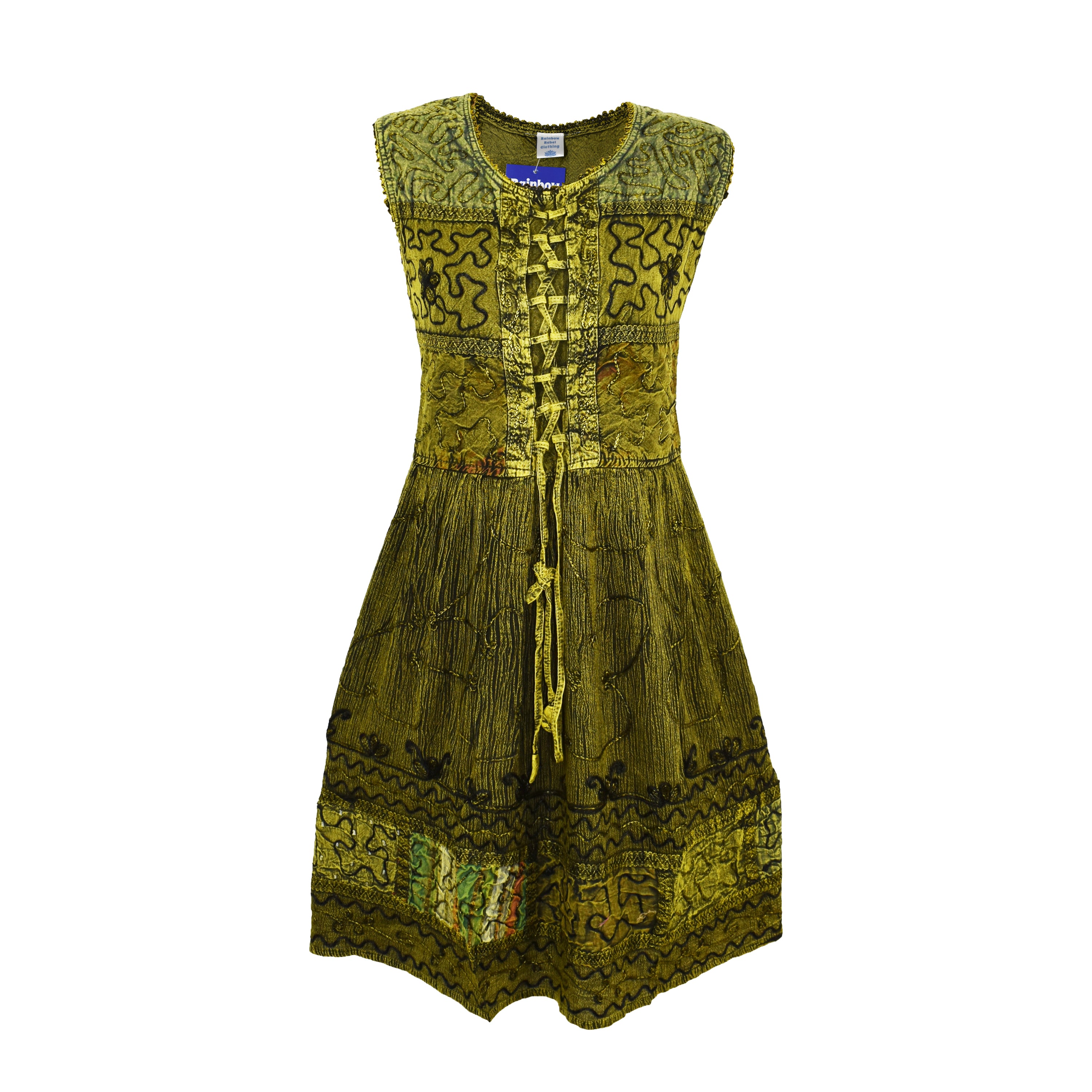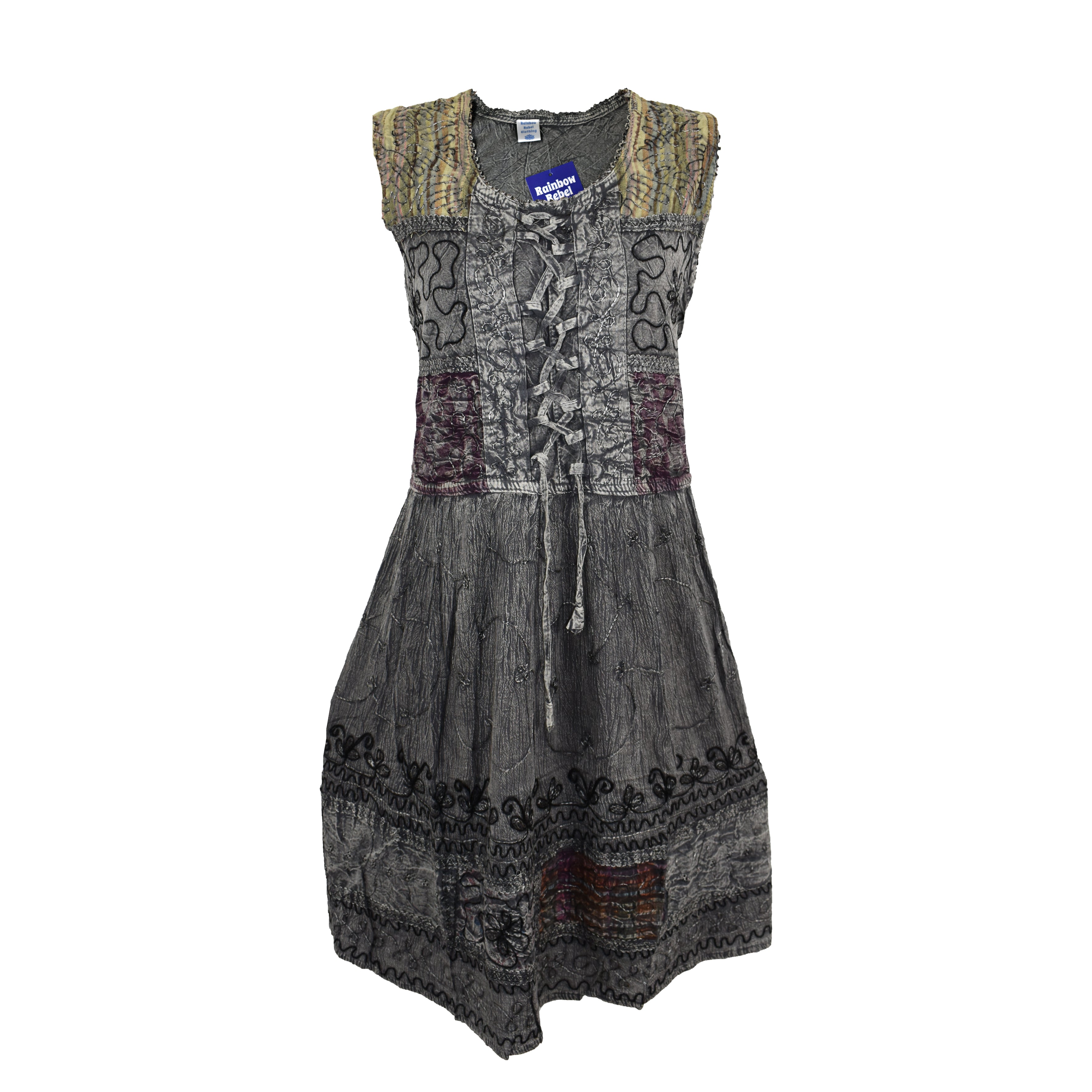 Made from soft stonewashed viscose, it features beautiful floral embroidery with subtle patchwork detailing for a relaxed, artisan feel. The sleeveless cut keeps it cool, while the front lace-up detail and adjustable back ties allow you to create a flattering, fitted shape.