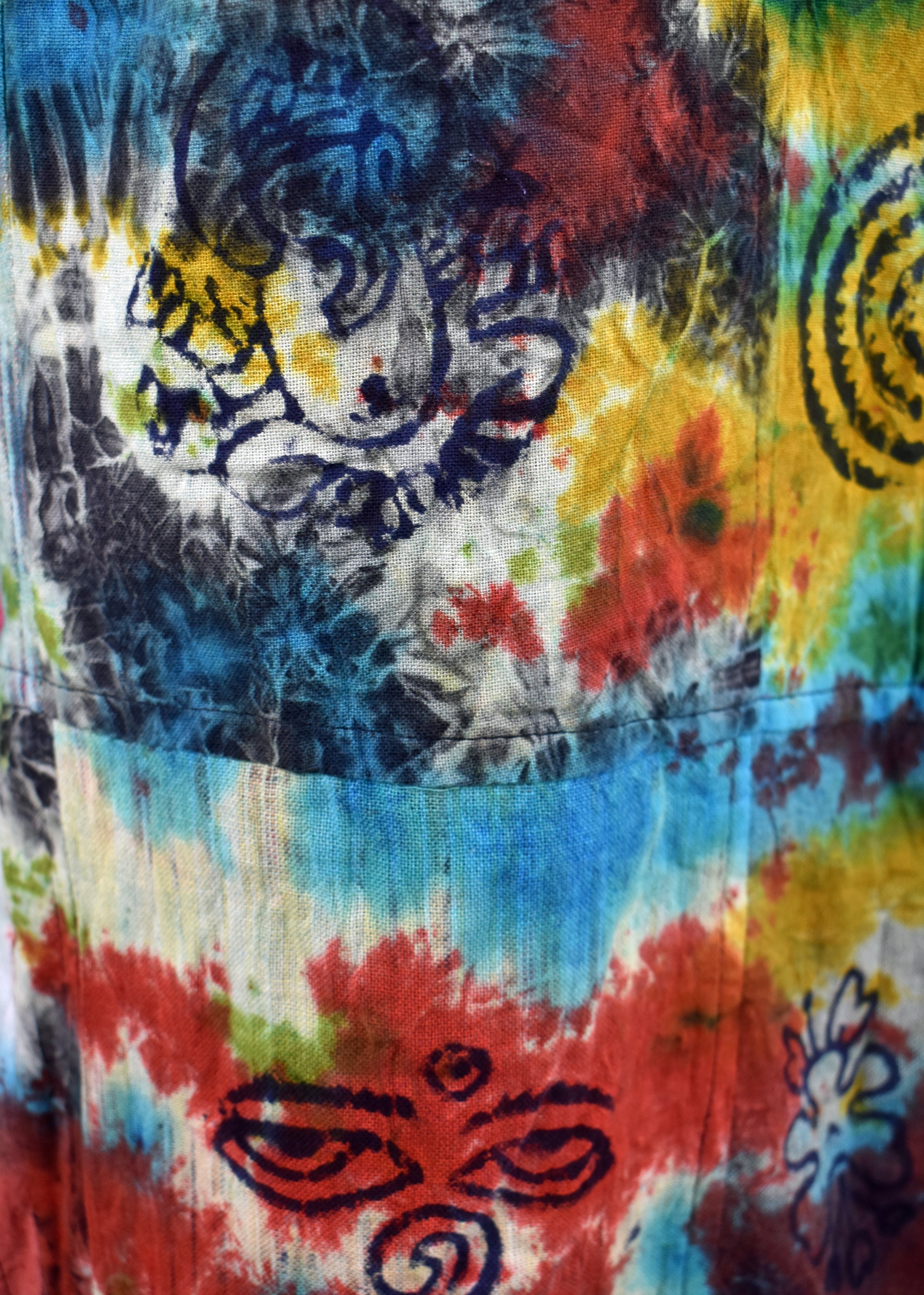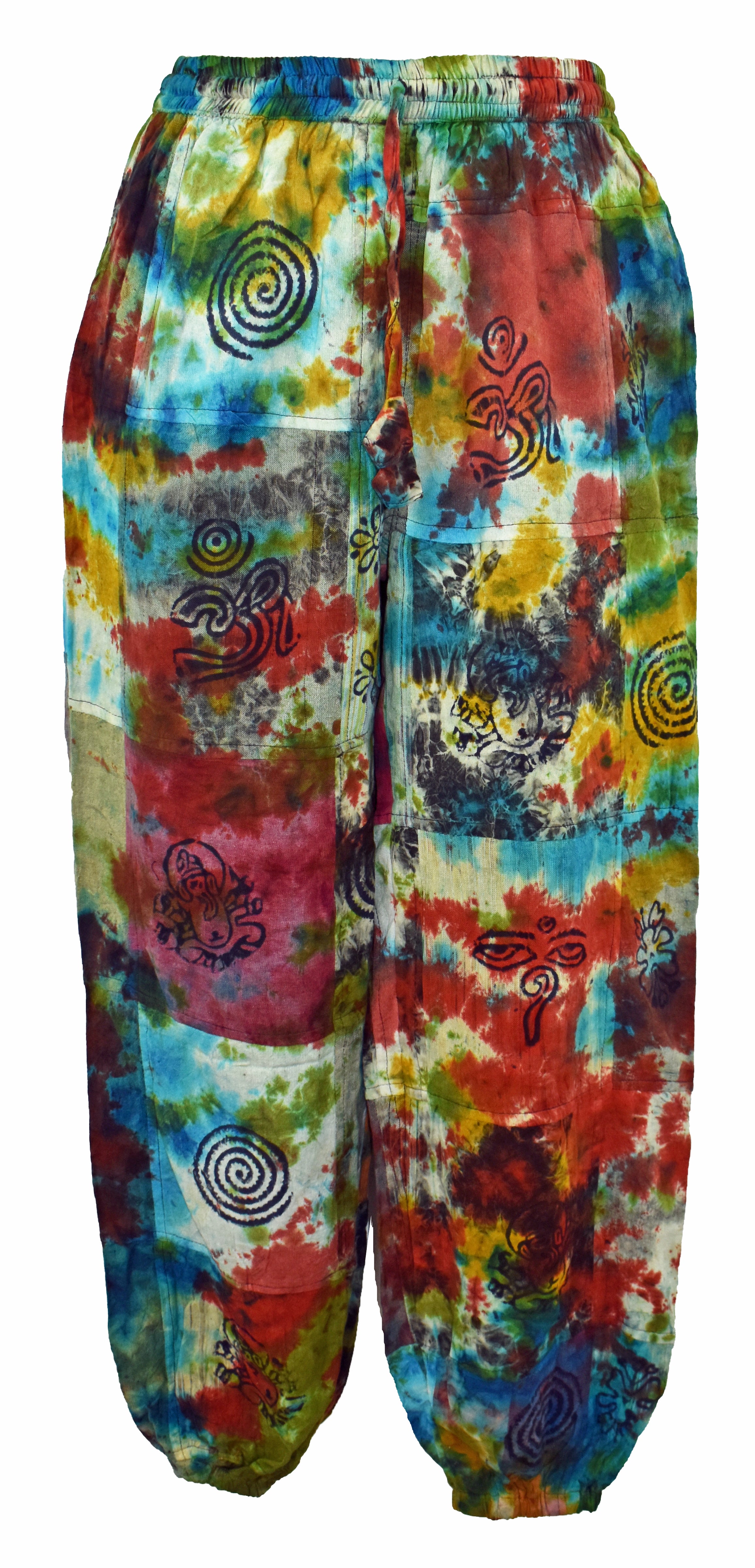 These trousers have been made from patchwork striped cotton, tie dyed and then hand block printed with Ganesh, Tibetan knots, lotus flowers and sun patterns. They have pockets on the hips and thighs plus an elasticated waist with draw cord. All trousers have the same colours and print but placement of colour may vary to photos.