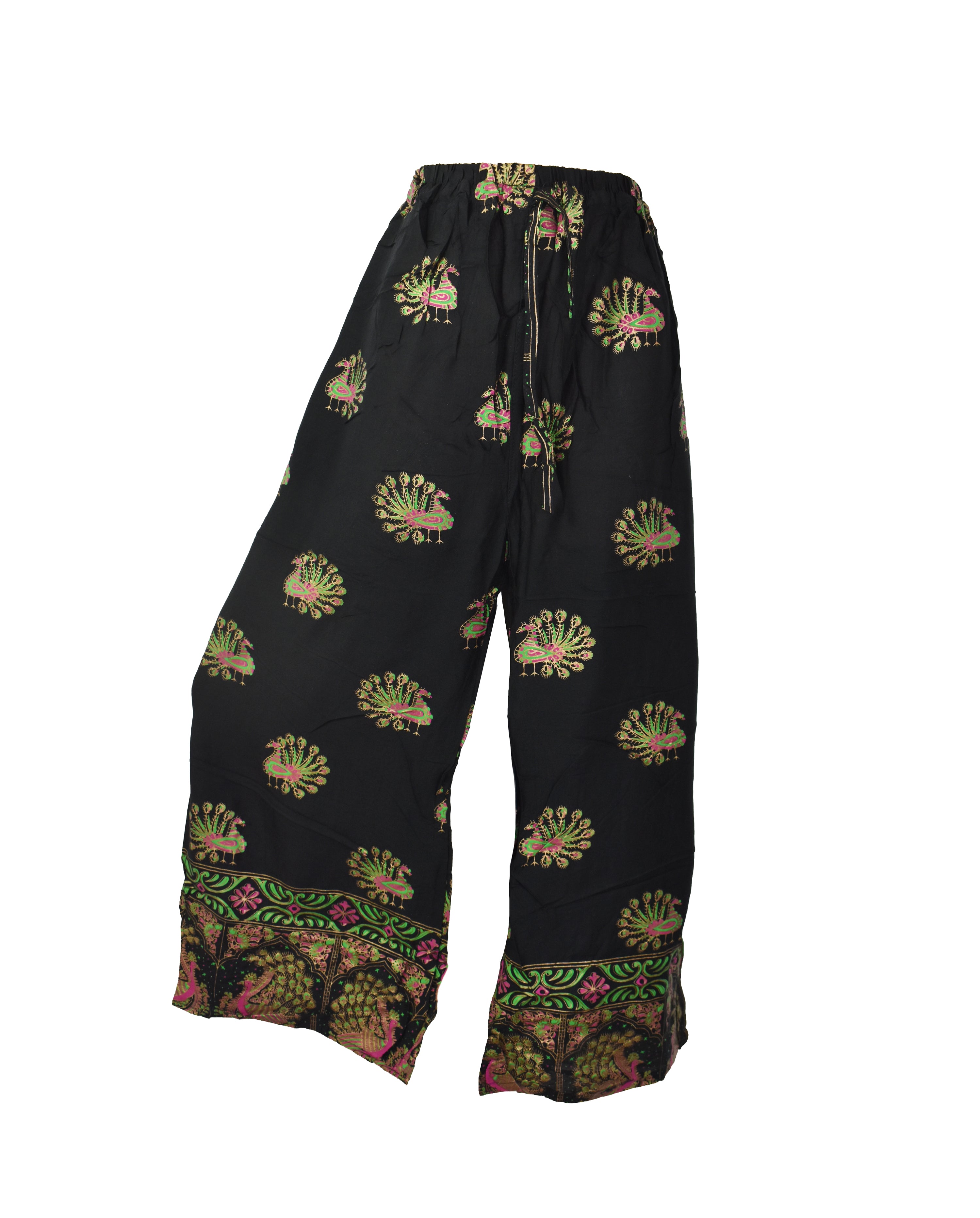 These rayon trousers have been hand block printed with gold peacocks all over especially the bottom hem. Full elasticated waist with draw cord. Suggested best fit a 10-14/16 depending on measurements.