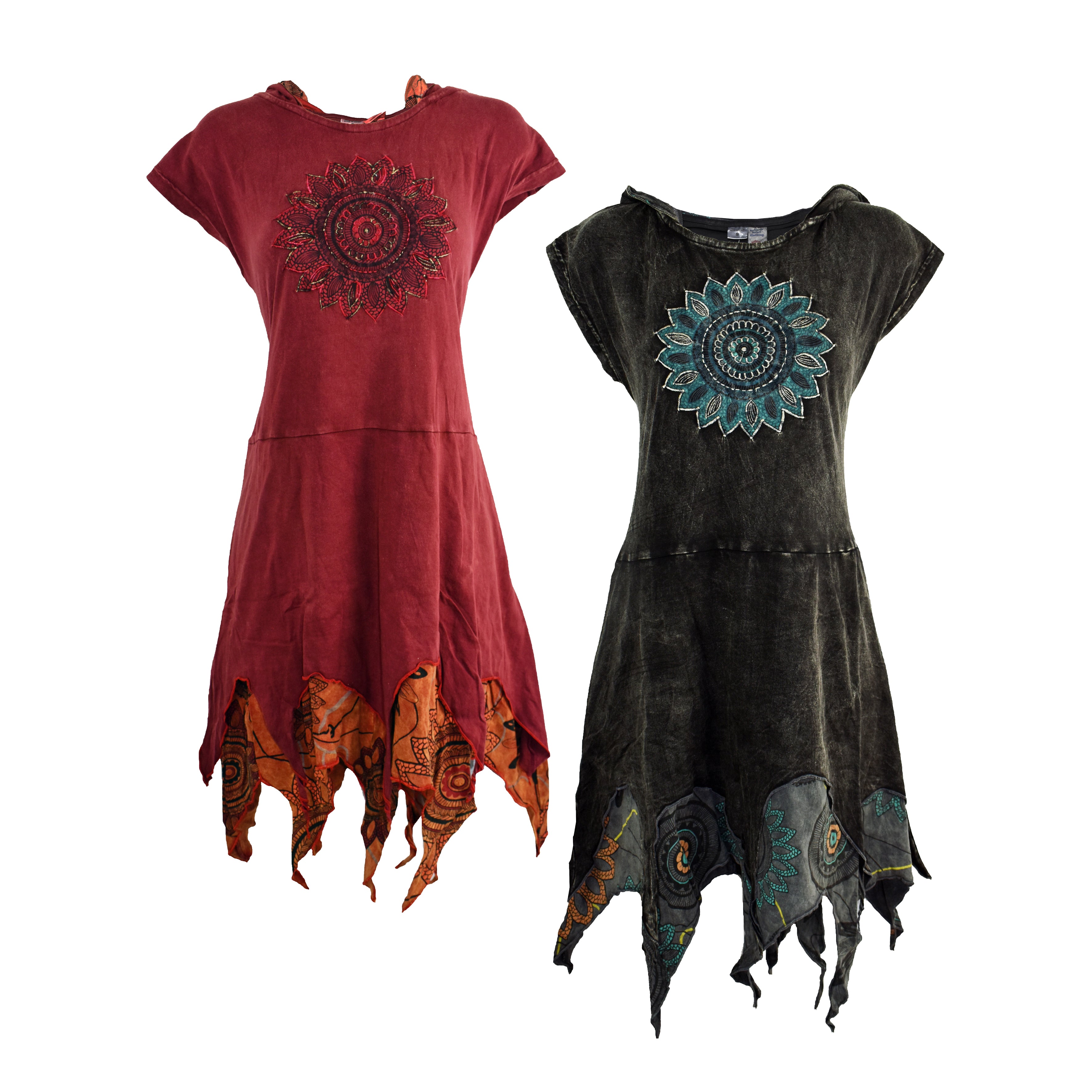 These dresses are made from stonewashed cotton with contrasting double layer bottom hem and inside hood detail.  On the front is an embroidered flower pattern.  The fabric does have a little stretch and the dress comes to around knee length depending on height.  Model in photos is a 14 and wearing the small.  Machine washable on a cool wash.