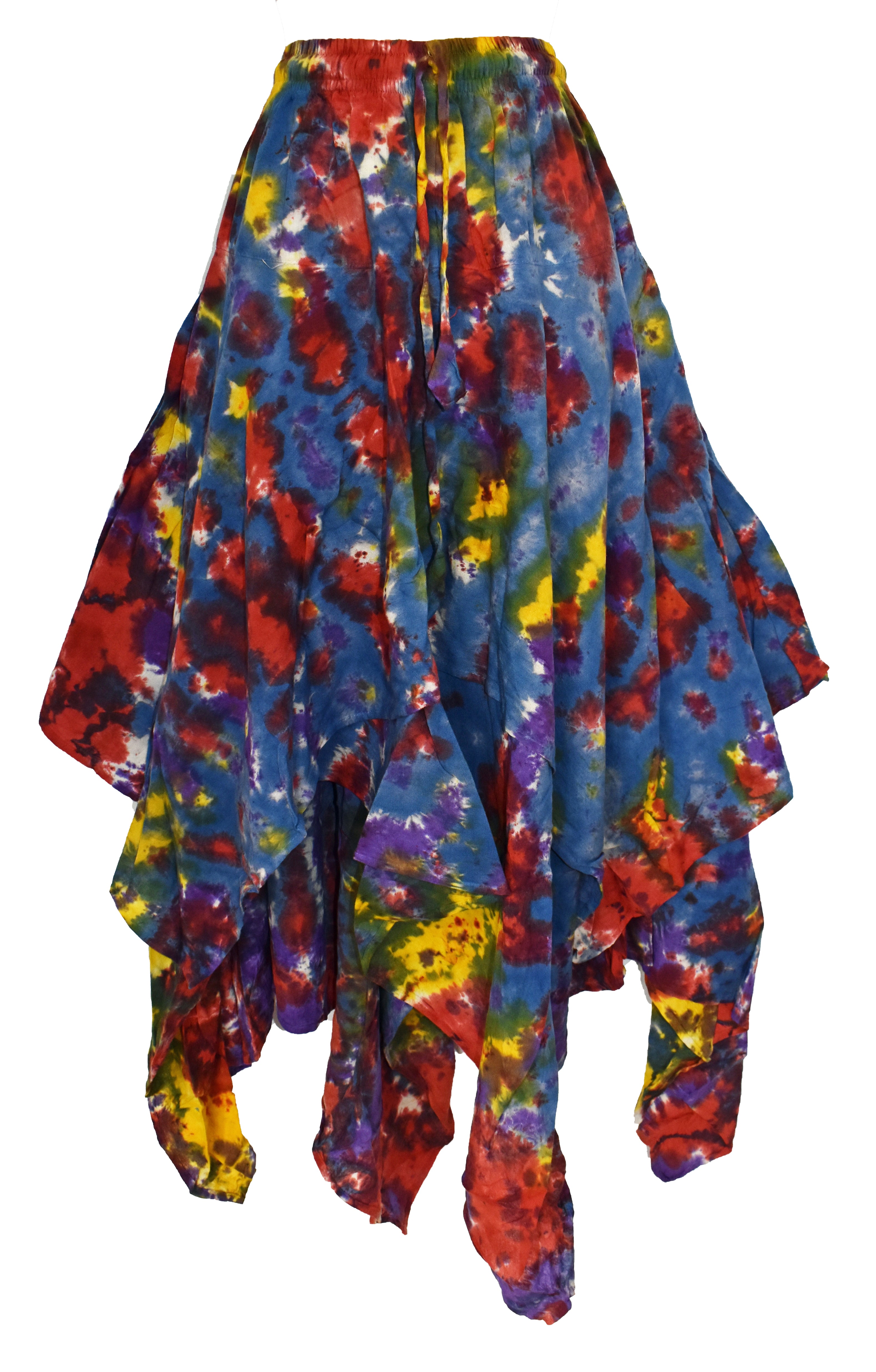 Just like our main range of these skirts except smaller!  These are made from tie dye cotton with elasticated waist and draw cord.  Made of two layers the bottom hem is zig zag in a pixie style.  Great bare legged in Summer or with leggings and boots in Winter.  These come in one size suitable for UK 6 - 12 depending on your own measurements.