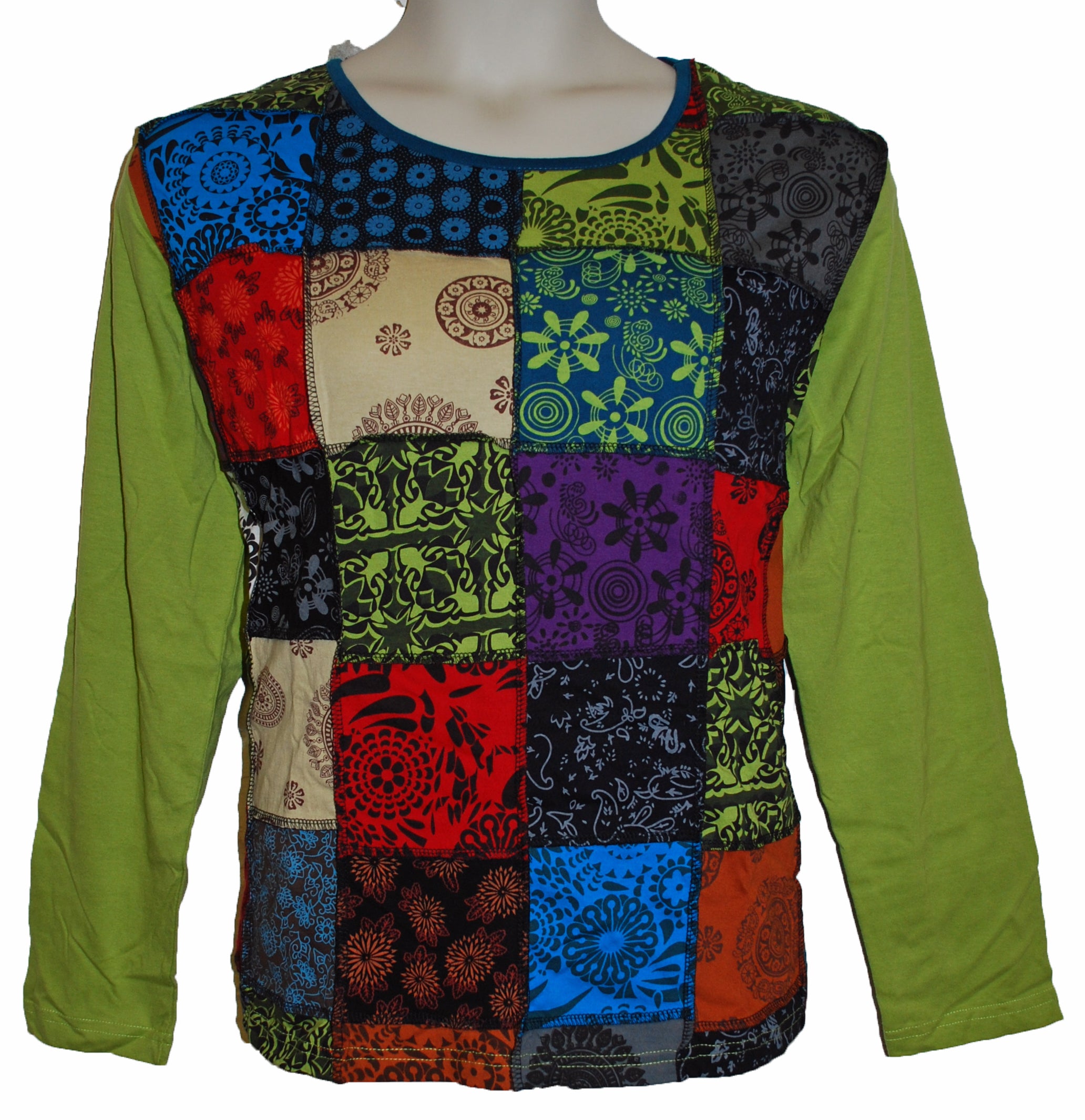 These tops have been designed by us and made on a fair trade basis by our master tailor in Nepal from soft t-shirt cotton.  The front is patchwork with printed patterns and the back is plain.  Machine washable on a cool wash and line dry!  These tops would look great with jeans or leggings both at festivals and for daily wear! Made a little longer in the body and in sleeve width for comfort!
