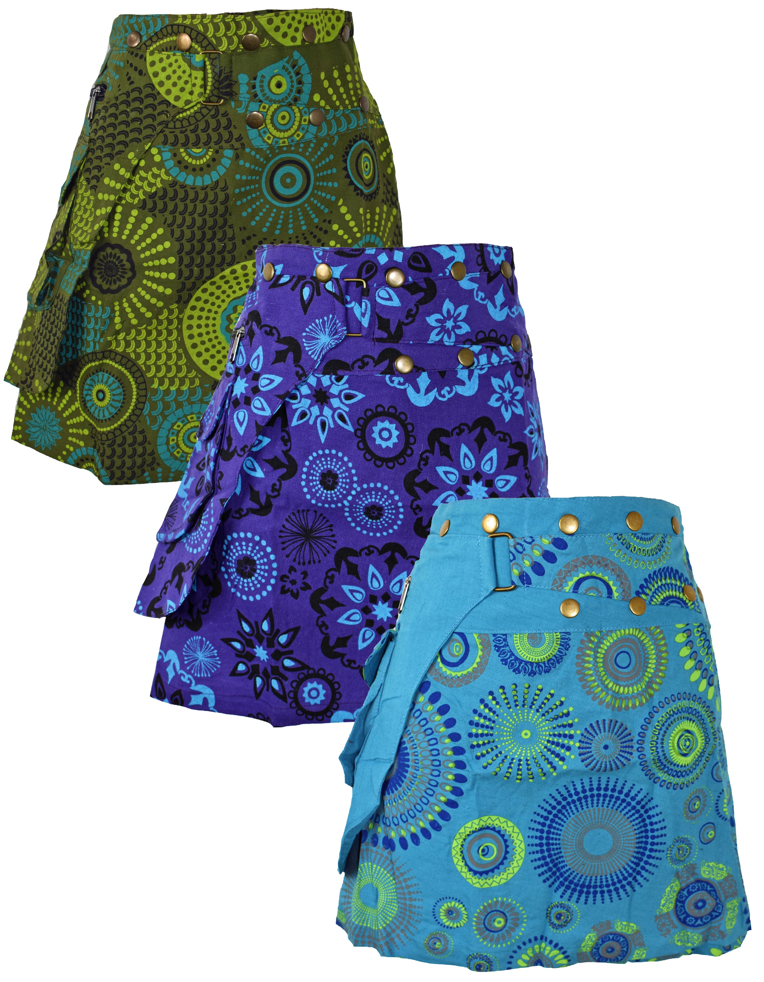 These popper skirts are made from printed cotton and have a hip bag with two pockets as part of the design.  The popper waist means they will fit several sizes of body from 8 - 16.  Great with bare legs in summer of with leggings in the winter.  Machine washable on a cool wash and line dry.