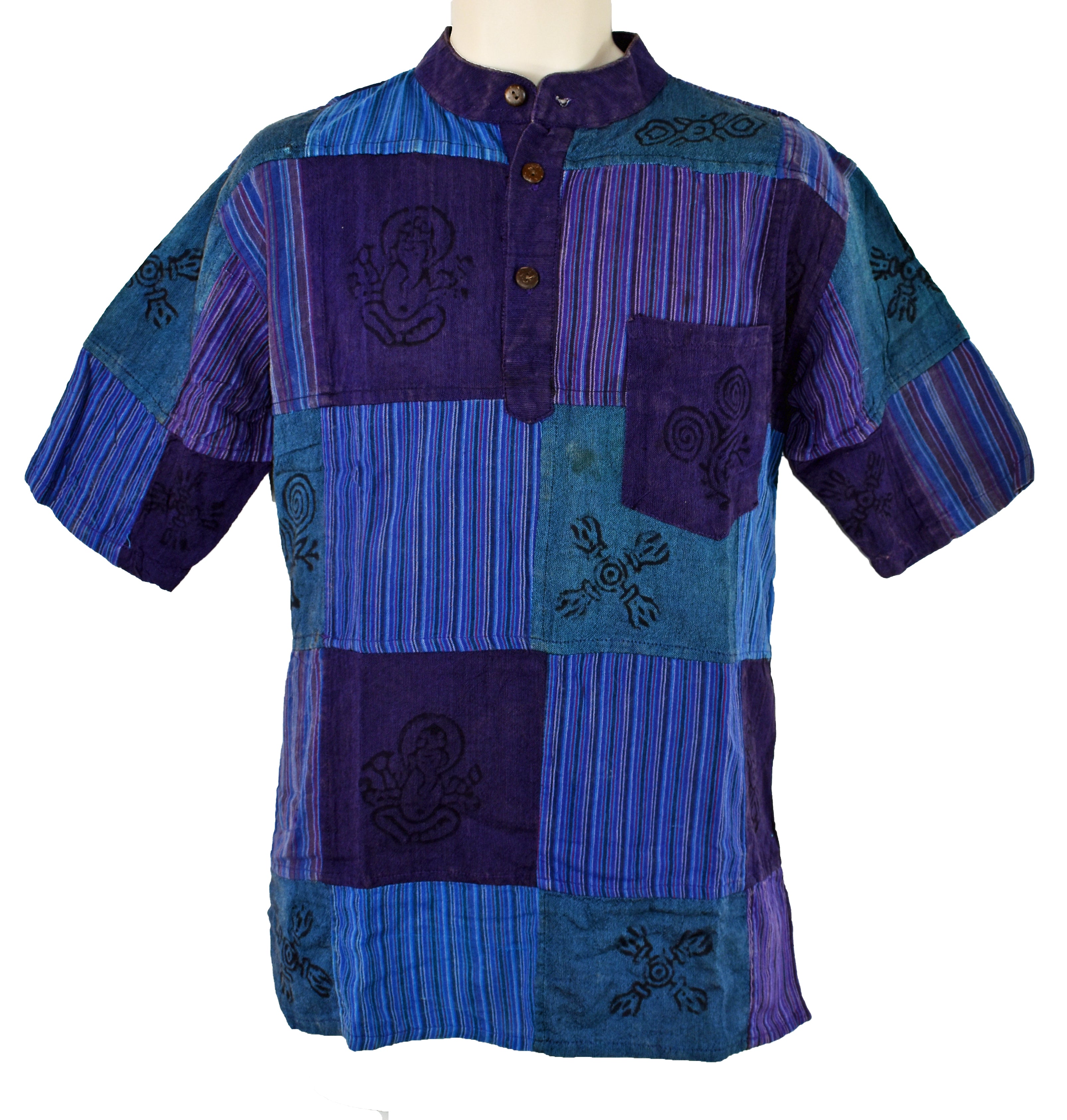These shirts have been made from patchwork stonewashed cotton which is then printed by hand with Nepalese motifs such as Tibetan knot or lotus flower.  Available in four sizes.  Hip pocket, chest pocket and three chest buttons.  Suggest leave 4" of room for movement.