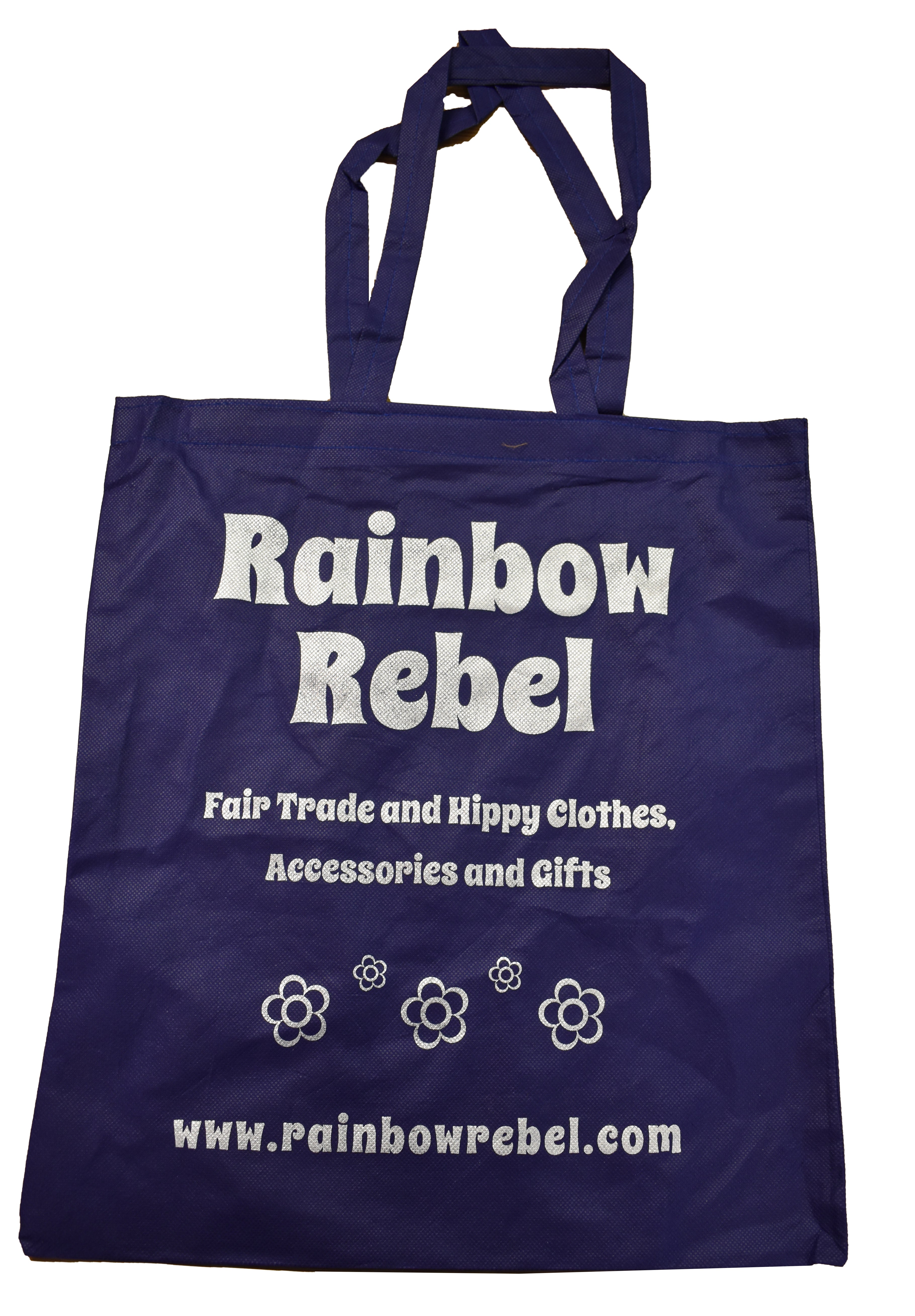 We have never used plastic carrier bags at Rainbow Rebel.  Instead a family in India hand screen print these tote shopping bags on a Fair Trade basis, the body of which is made from a mixture of recycled paper and cotton.  A small recycled plastic tab (from water bottles) is used at the base of each handle to strengthen it.  We have had customers come back to us a year later to reuse the same bag!  These bags are biodegradable, recyclable and made to last.  Selling them on here at cost, including shipping cost as customers keep asking for them!