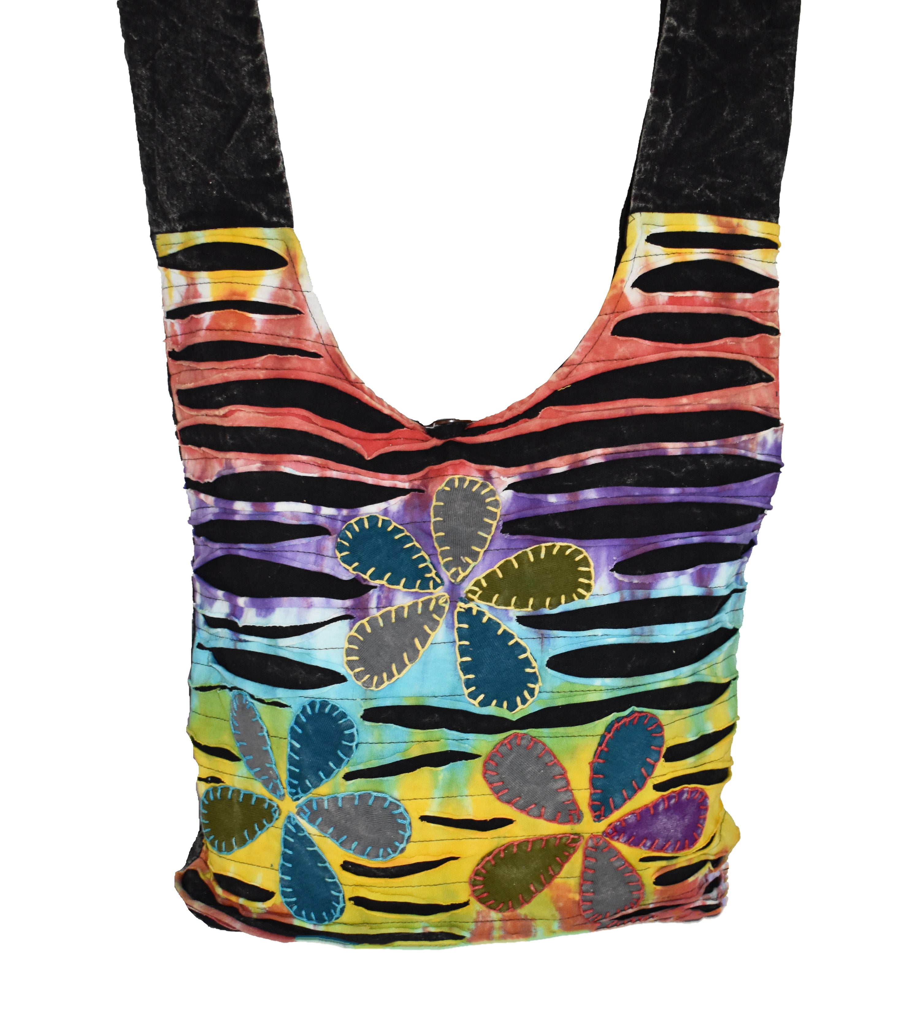 A roomy, beautifully textured monk bag made from stonewashed, tie-dye cotton with classic razor-cut detailing. The front features colourful embroidered patchwork flowers, while the back is plain stonewashed cotton for a balanced, natural look. Fully lined in black cotton for strength and durability.