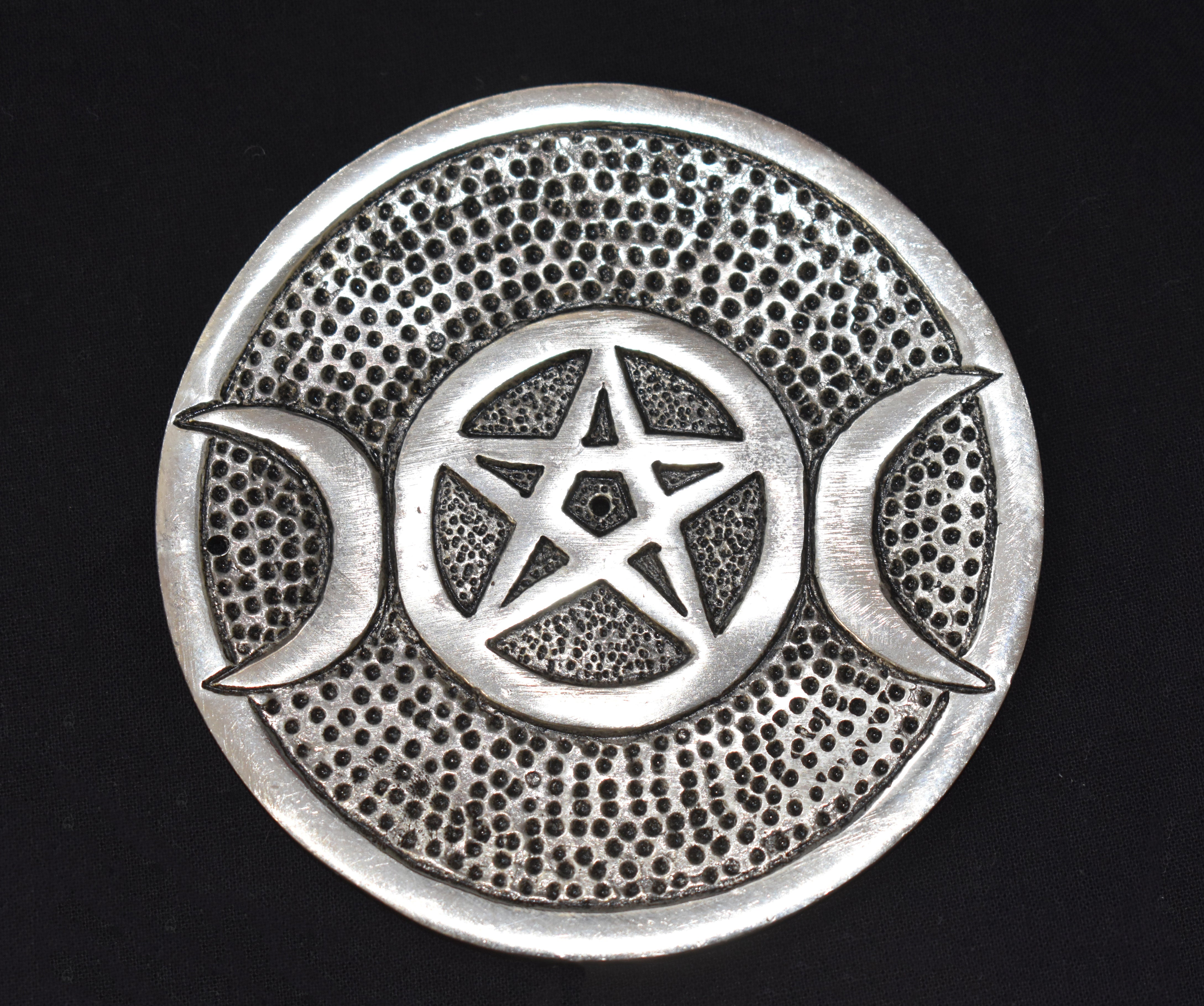 Made from recycled aluminium metal these ash catcher dishes have the moon and pentagram on the front with a hole for the incense stick and the underneath has a flower of life motif and stand feet. Measuring 10cm in diameter.