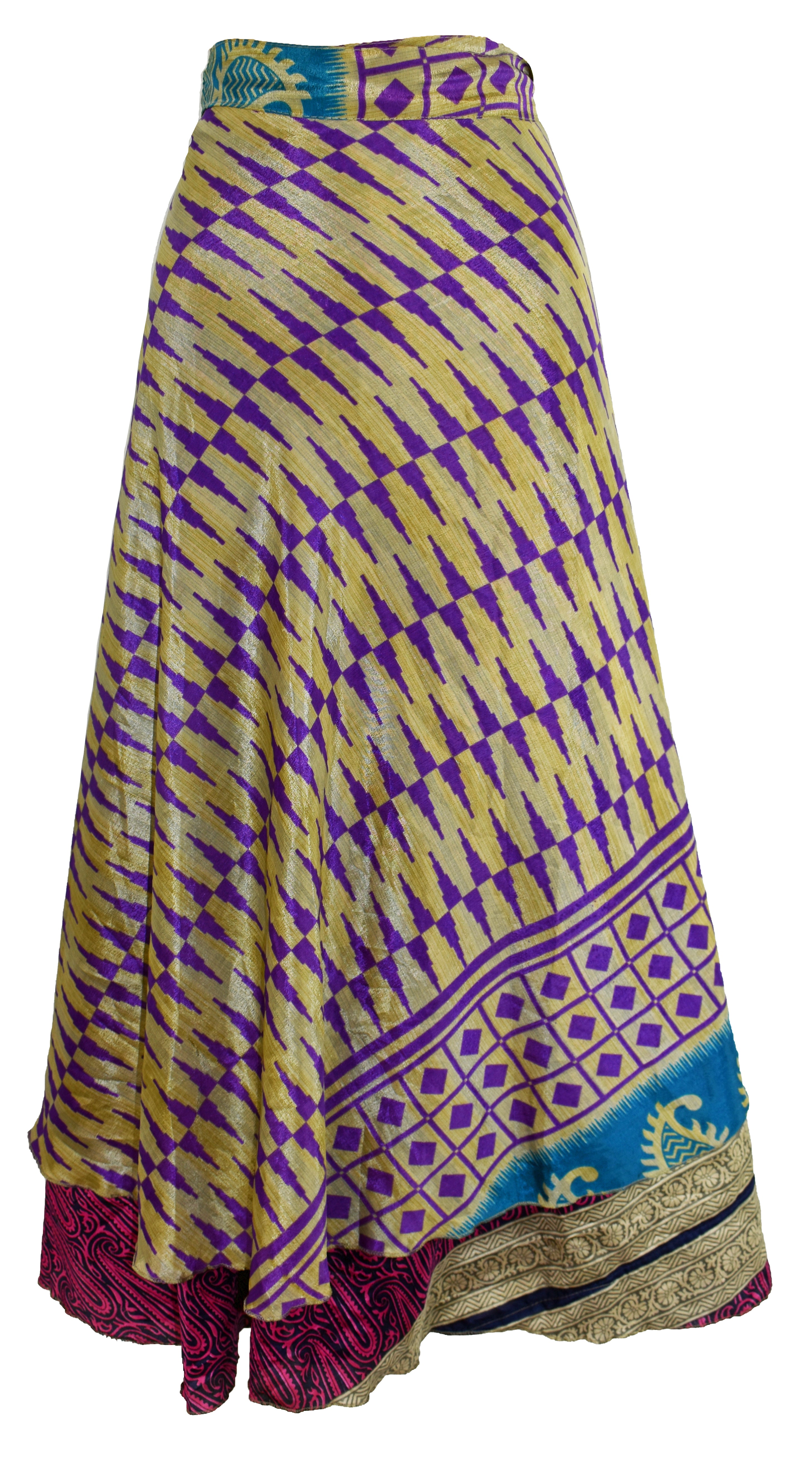 These stunning skirts are each unique, being made from sari silk fabric.  They have been made in Pushkar in Rajasthan for Rainbow Rebel on a Fair Trade basis to our design.  Made from two layers they are reversible with the inner layer shorter so can be worn with either fabric outwards.  Whilst the waist is 48" (122cm) it is suggested for anyone with waist or hips 40" (102cm) max to allow a good section of overlap.  Suggested best fit anyone from a size 12 - 18.