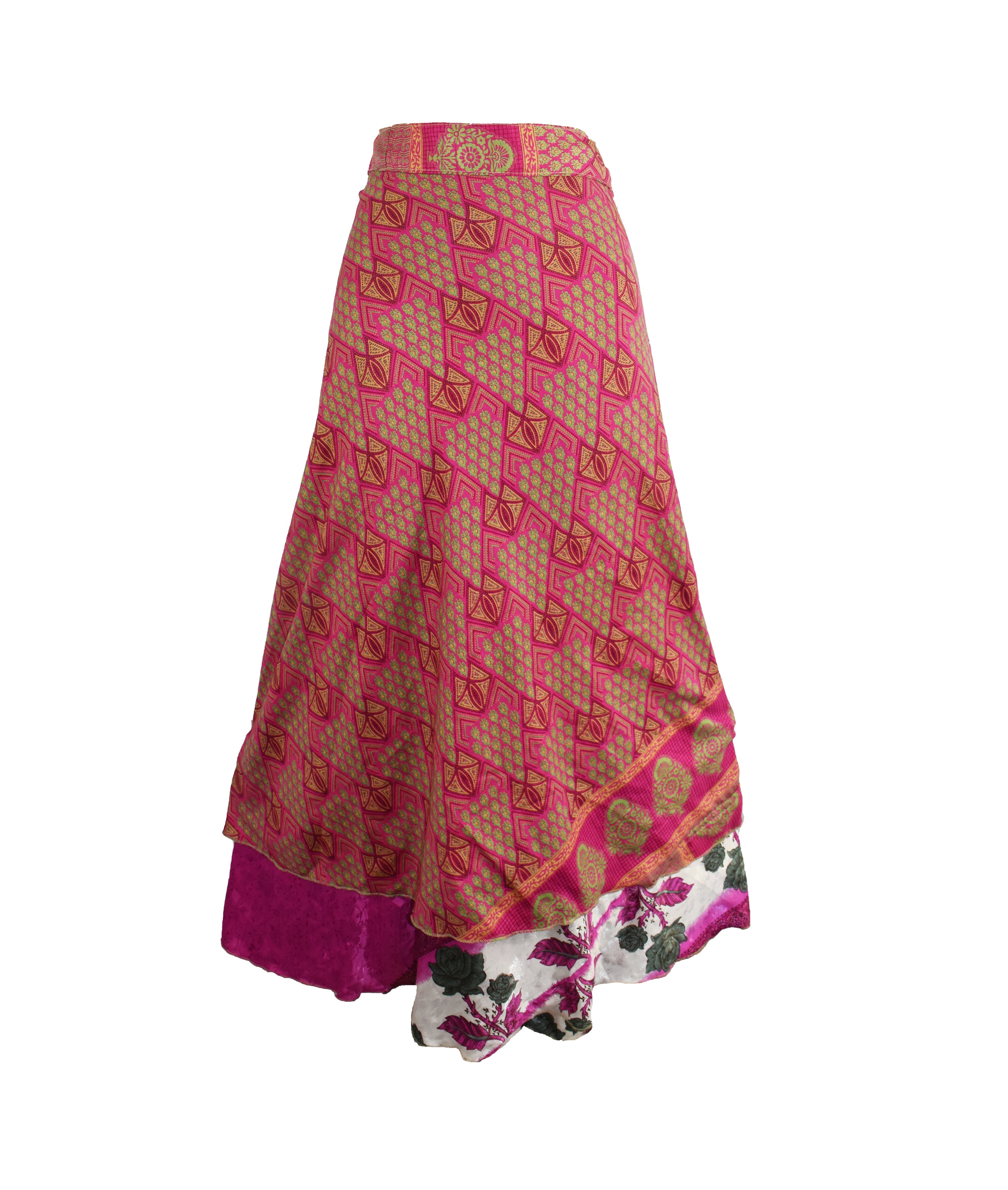 These stunning skirts are each unique, being made from sari silk fabric.  They have been made in Pushkar in Rajasthan for Rainbow Rebel on a Fair Trade basis to our design.  Made from two layers they are reversible with the inner layer shorter so can be worn with either fabric outwards.  Whilst the waist is 66" (167cm) it is suggested for anyone with waist and hips 54" (137cm) max to allow a good section of overlap.  Suggested best fit anyone from a size 18 - 24.