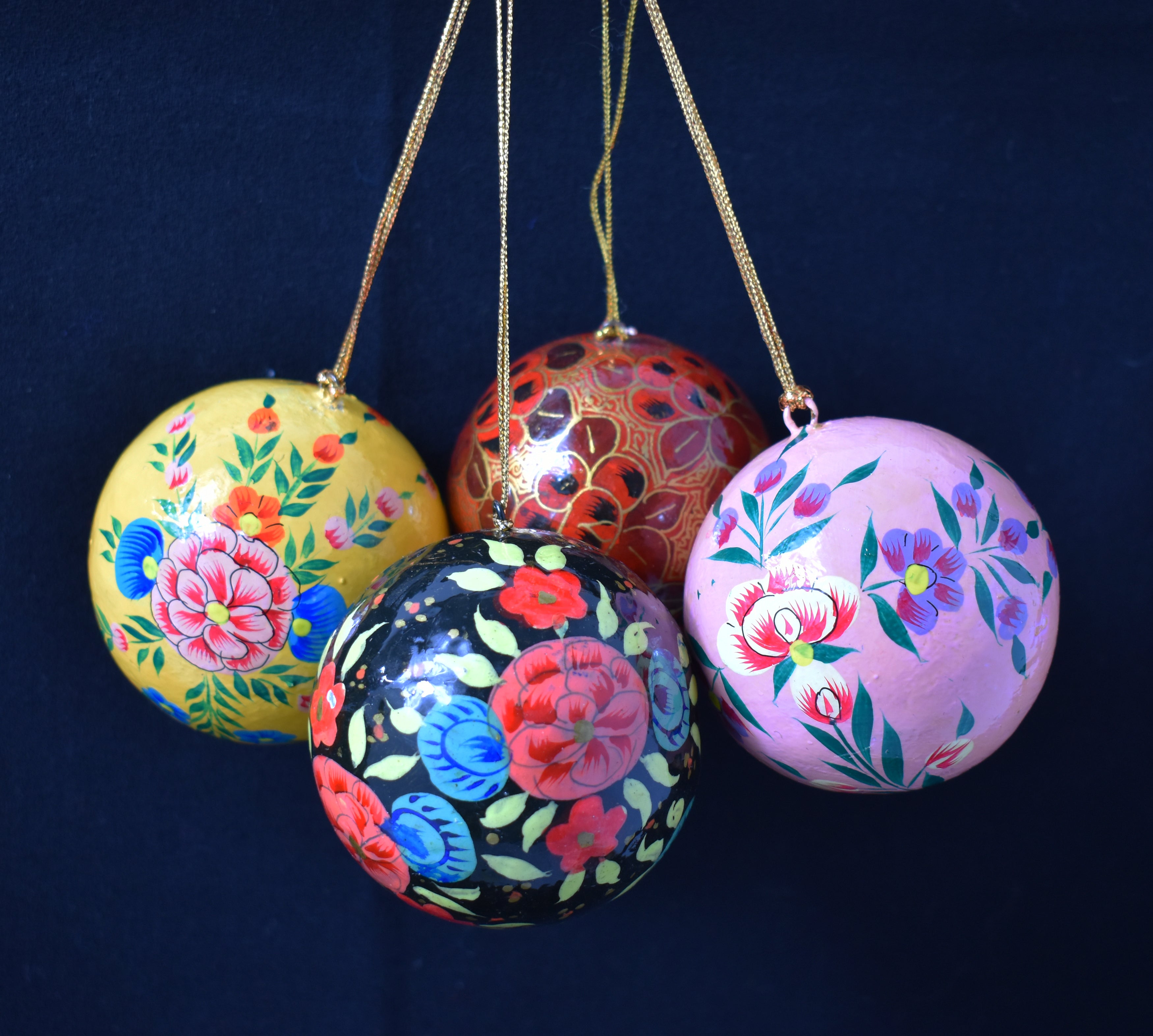 These beautiful baubles are made in Kashmir from wood pulp and recycled paper, then hand painted and varnished to create a glossy, durable finish that catches the light beautifully. Each piece is crafted by skilled artisans working under Fair Trade conditions.