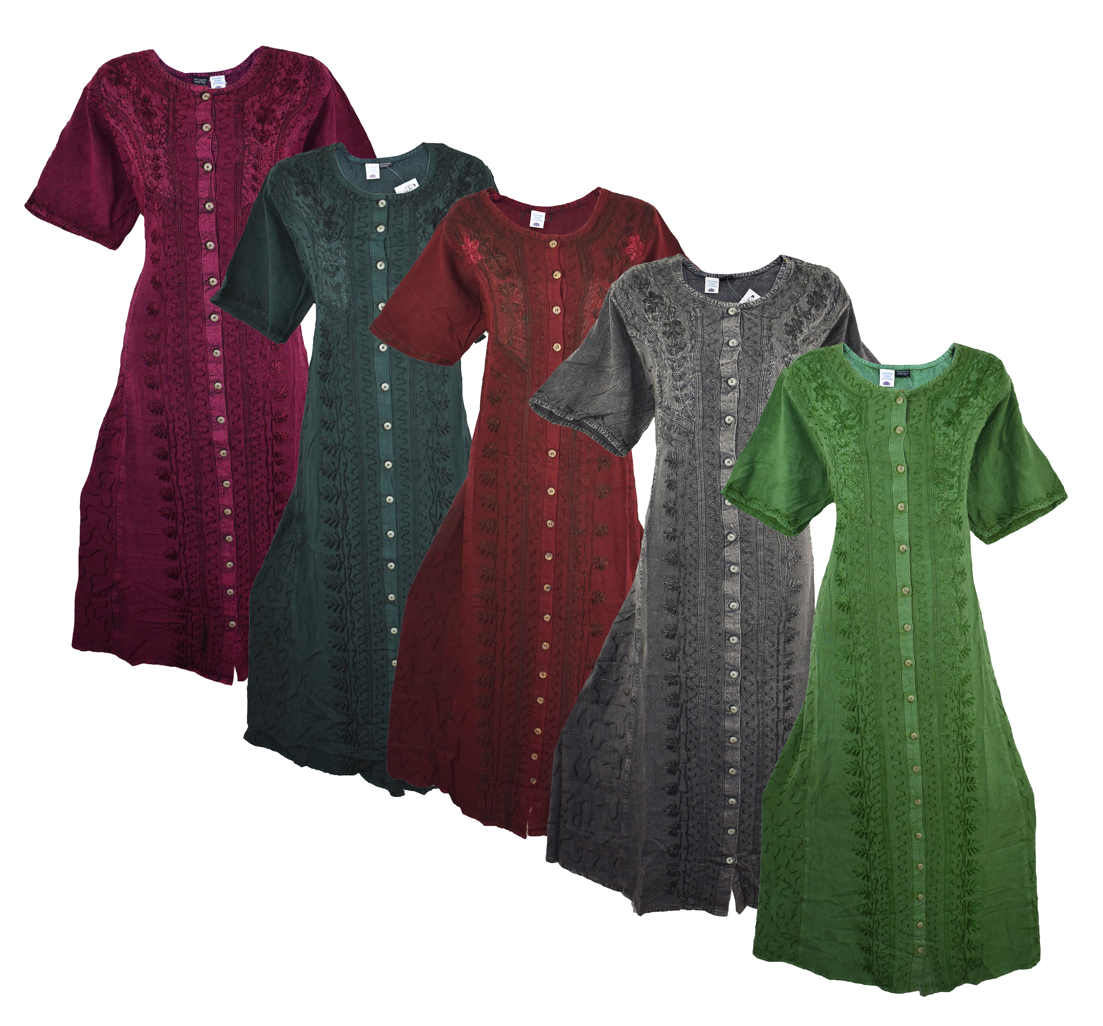 These dresses are made from stonewashed viscose with full length buttons on the front and ties at the back to adjust for a more fitted or floaty look. Suggested suitable for anyone size 14 to 18 depending on measurements. Model is a busty 16/18 and 5"4 tall.