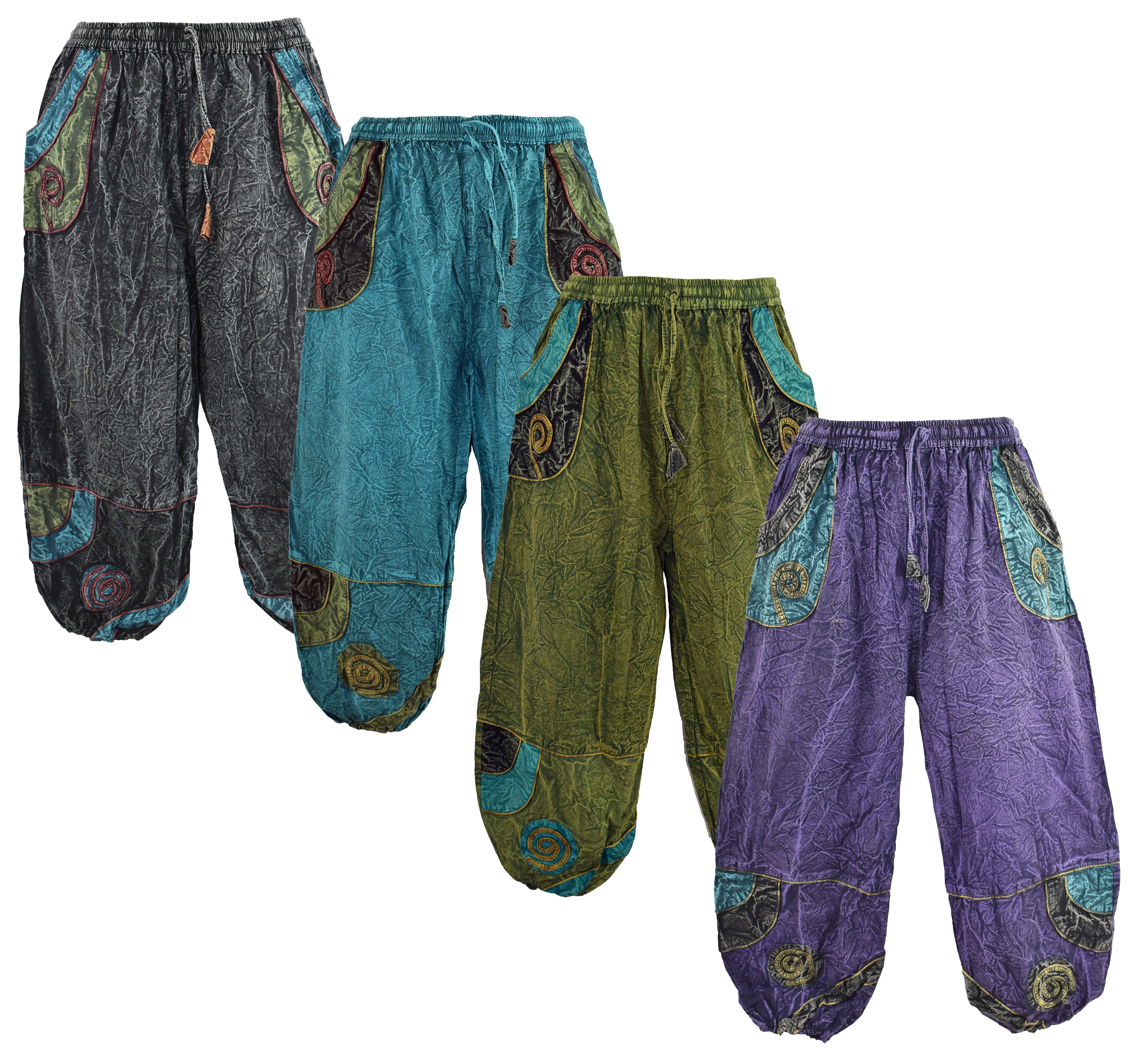 These trousers are made from stonewashed cotton with an elasticated waist with hip pockets.  Free size suggest best for anyone waist 24" - 36" to allow room for movement.  They come in 3 colour tones - red, green and teal.