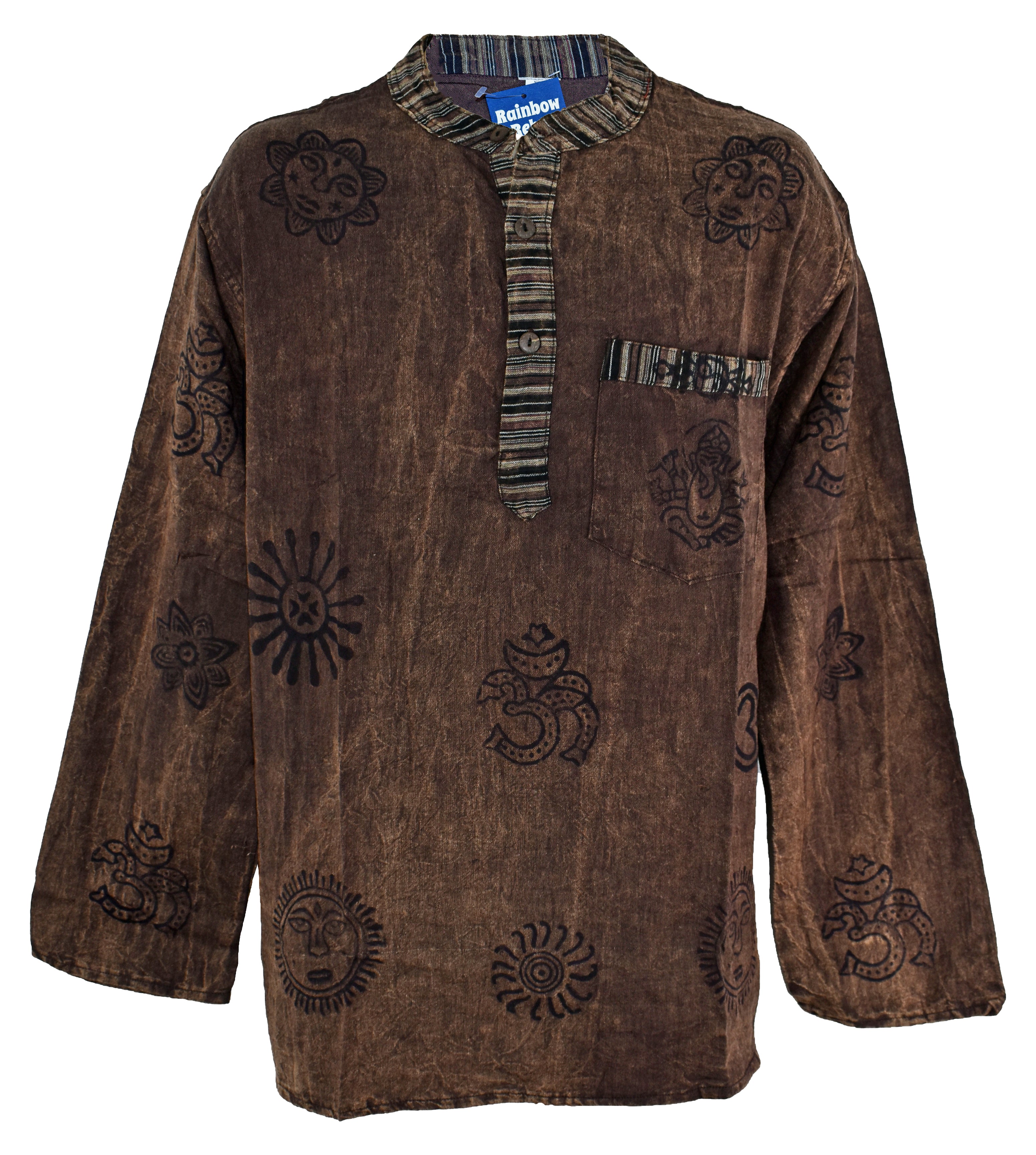 These shirts are made from a combination of plain cotton with striped cotton collar and details which is then stonewashed and hand block printed with Nepalese patterns such as the lotus, Ganesh and the knot. The print is the same but placement may vary to photos. Available in three sizes.
