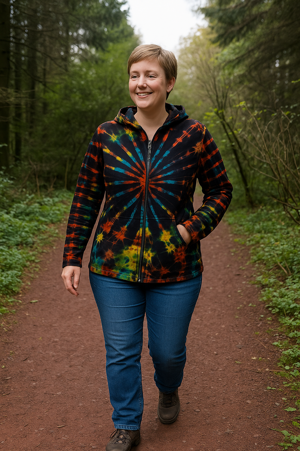Made from 100% cotton which has been tie dyed these hoodies have a round hood and two front pouch pockets.  Available in 5 sizes and two great colours!  Fabric will stretch 2" above listed below.  Model is a busty 16/18 wearing the Large.  Machine washable on a cold wash and line dry, do not wash with light coloured items for first few washes.