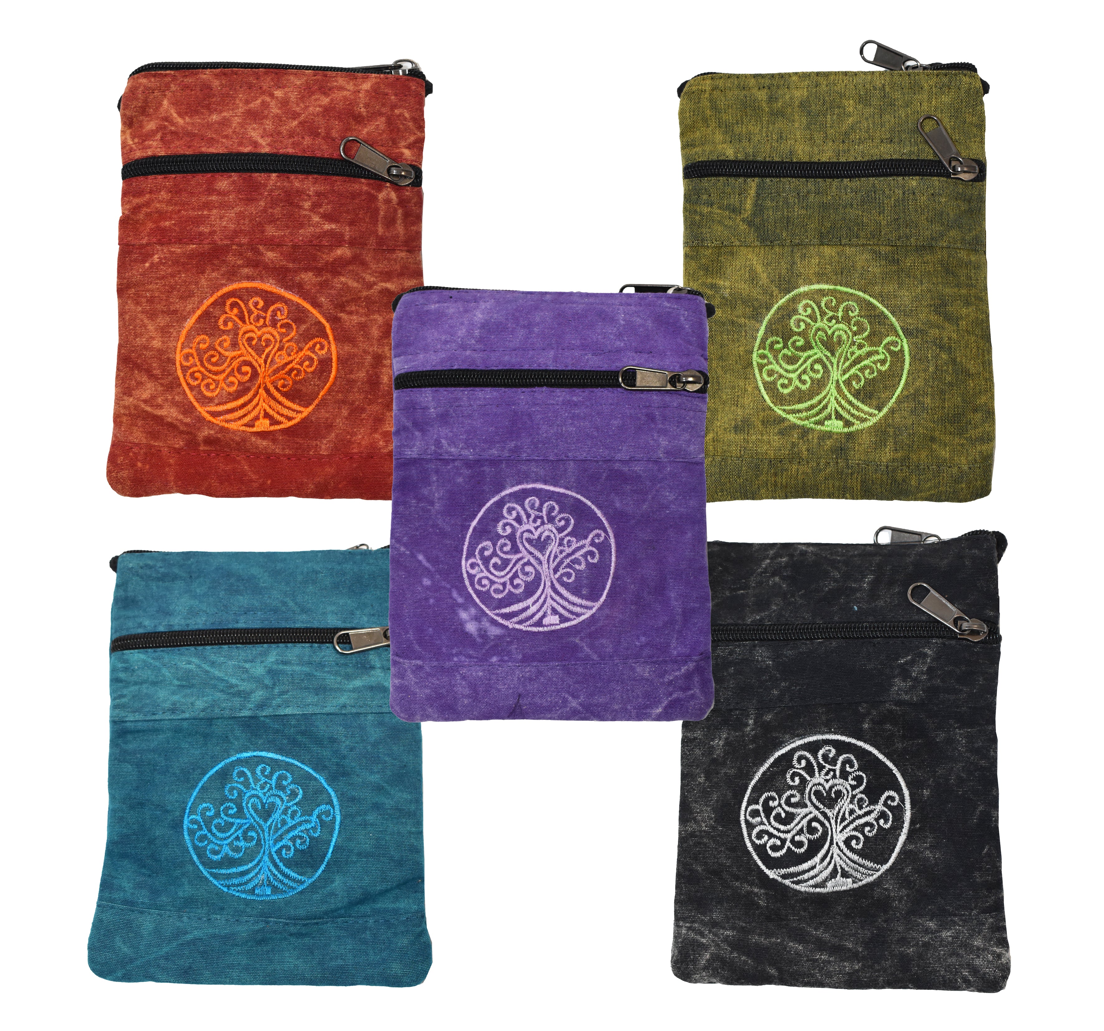These cute stonewashed cotton bags have two lined zip closing compartments and are just large enough for a phone in one pocket and money in the other. Each has a long cord for cross body or shoulder carrying. On the front is a tree of life motif.