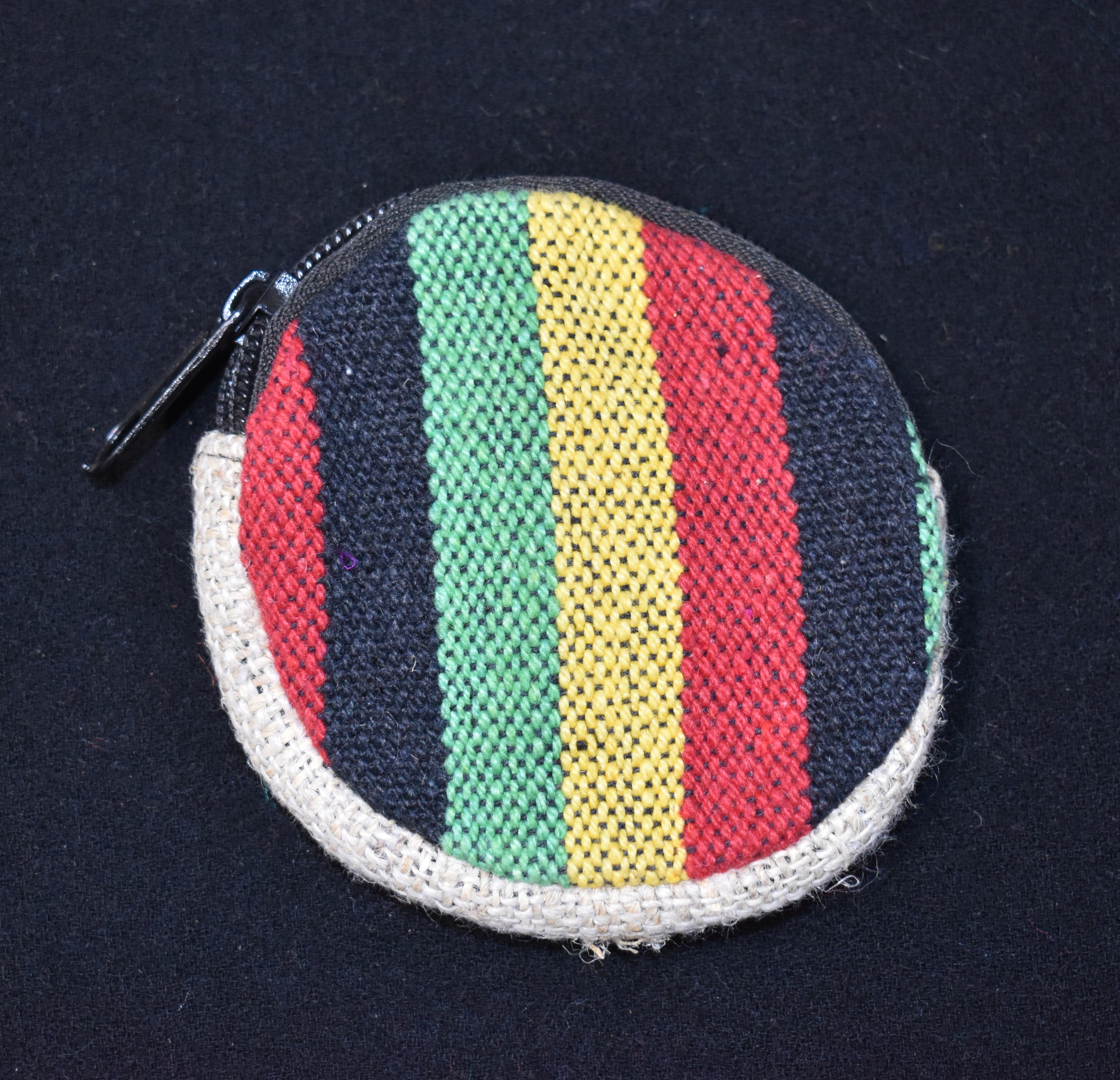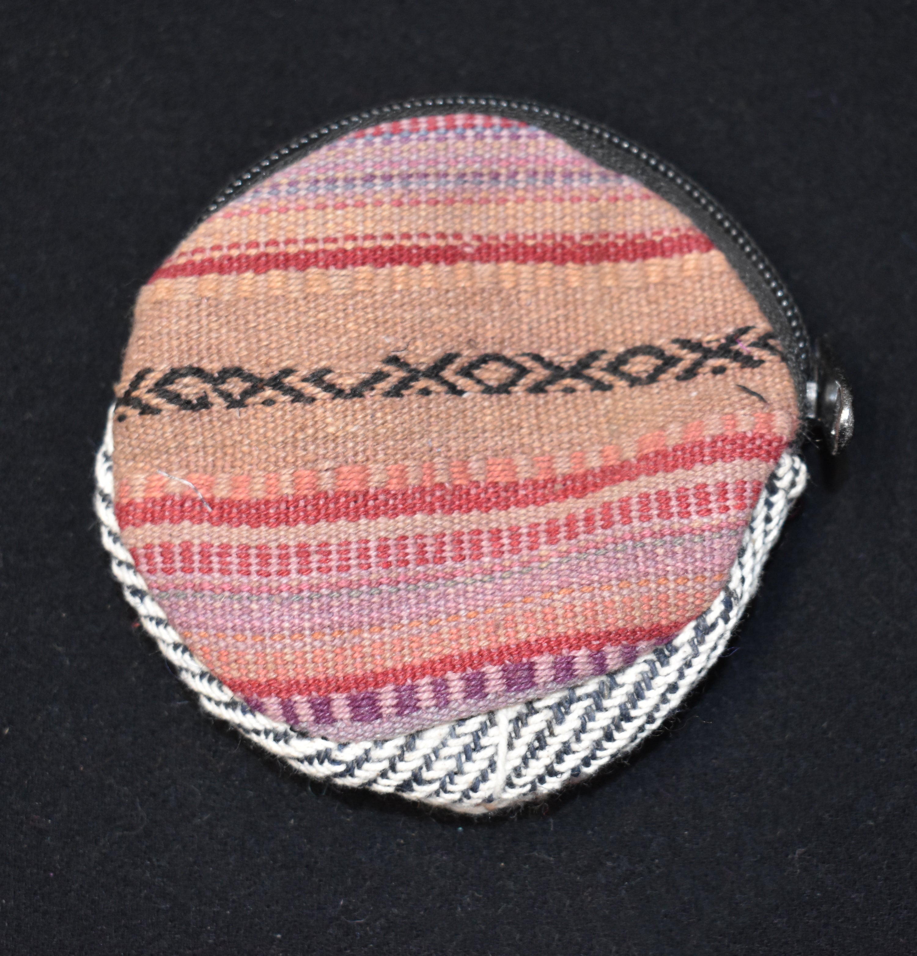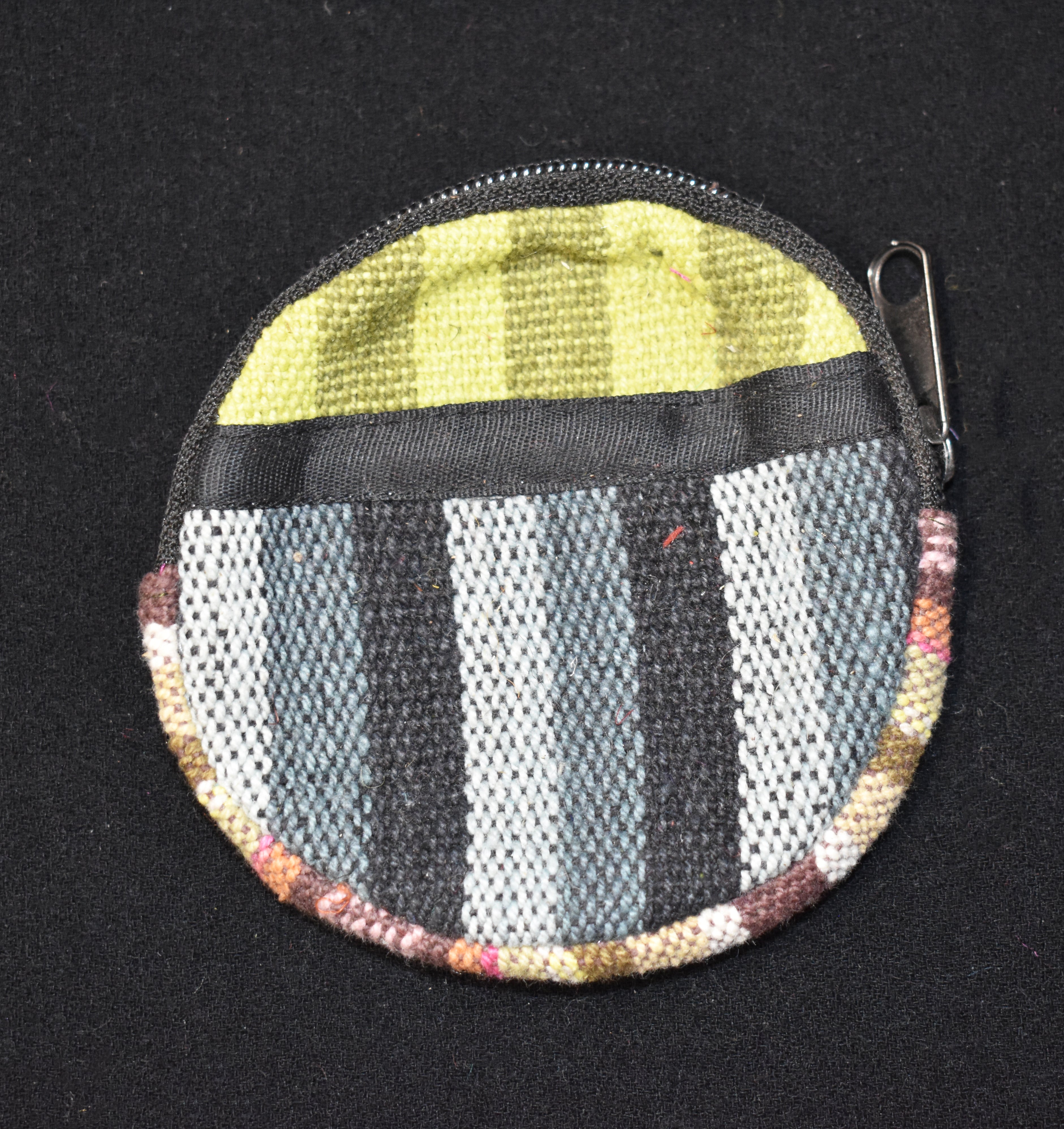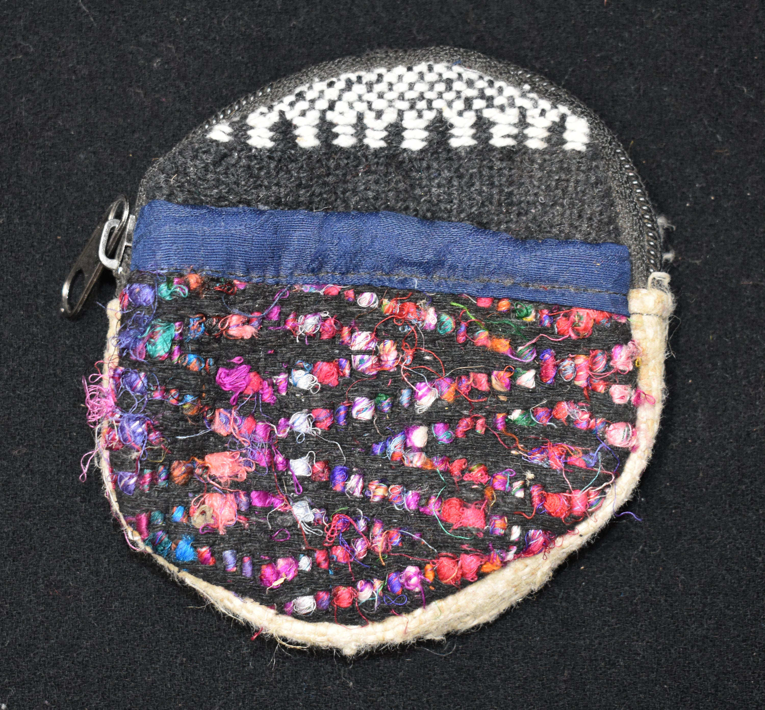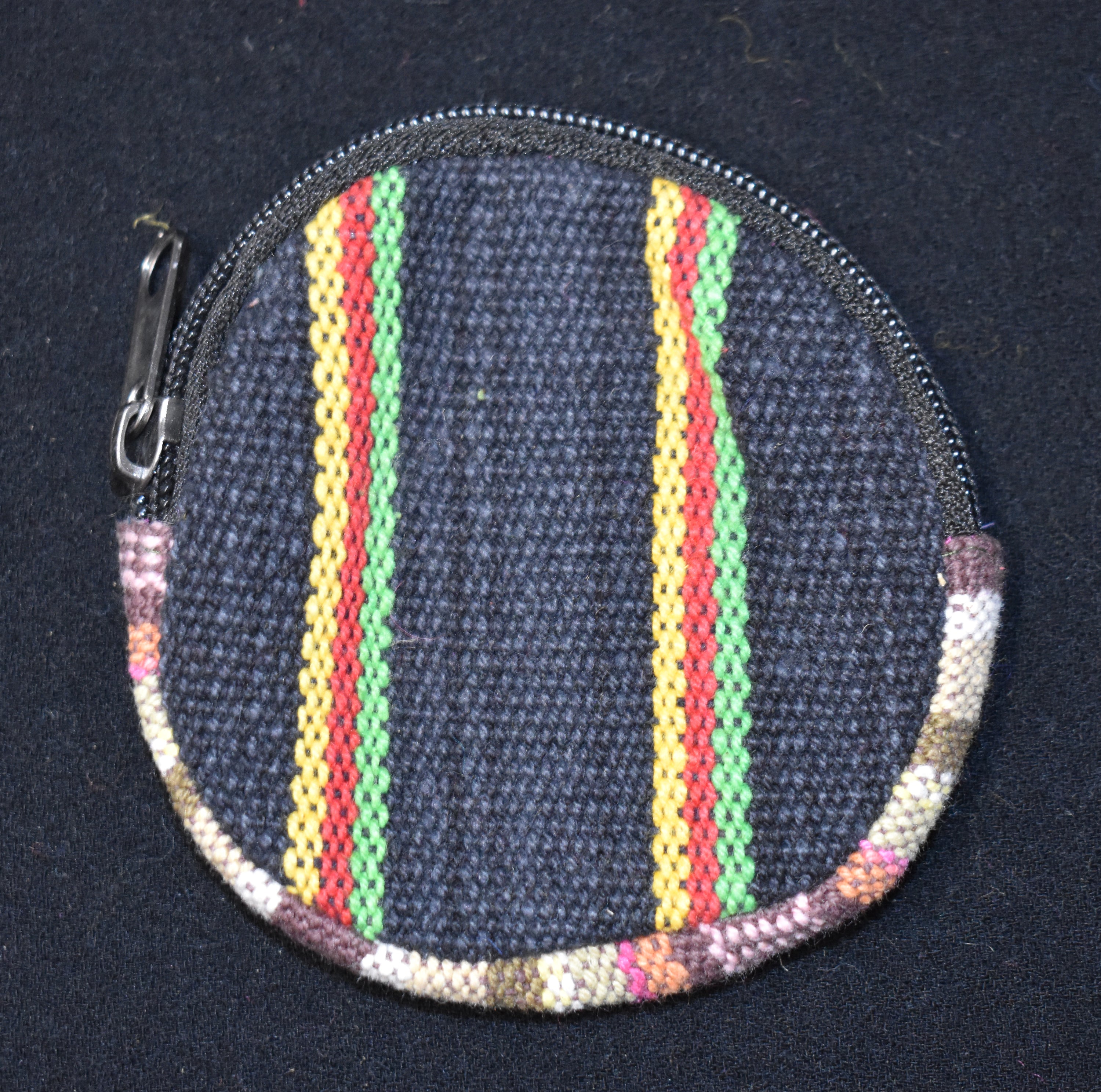 These cute little coin purses are made from woven cotton with a black cotton lining to the main compartment. There is also an outside open pocket. Measuring 10cm wide max they are large enough for coins and some cards. Four to choose from - photos show front and back of each purse in order.