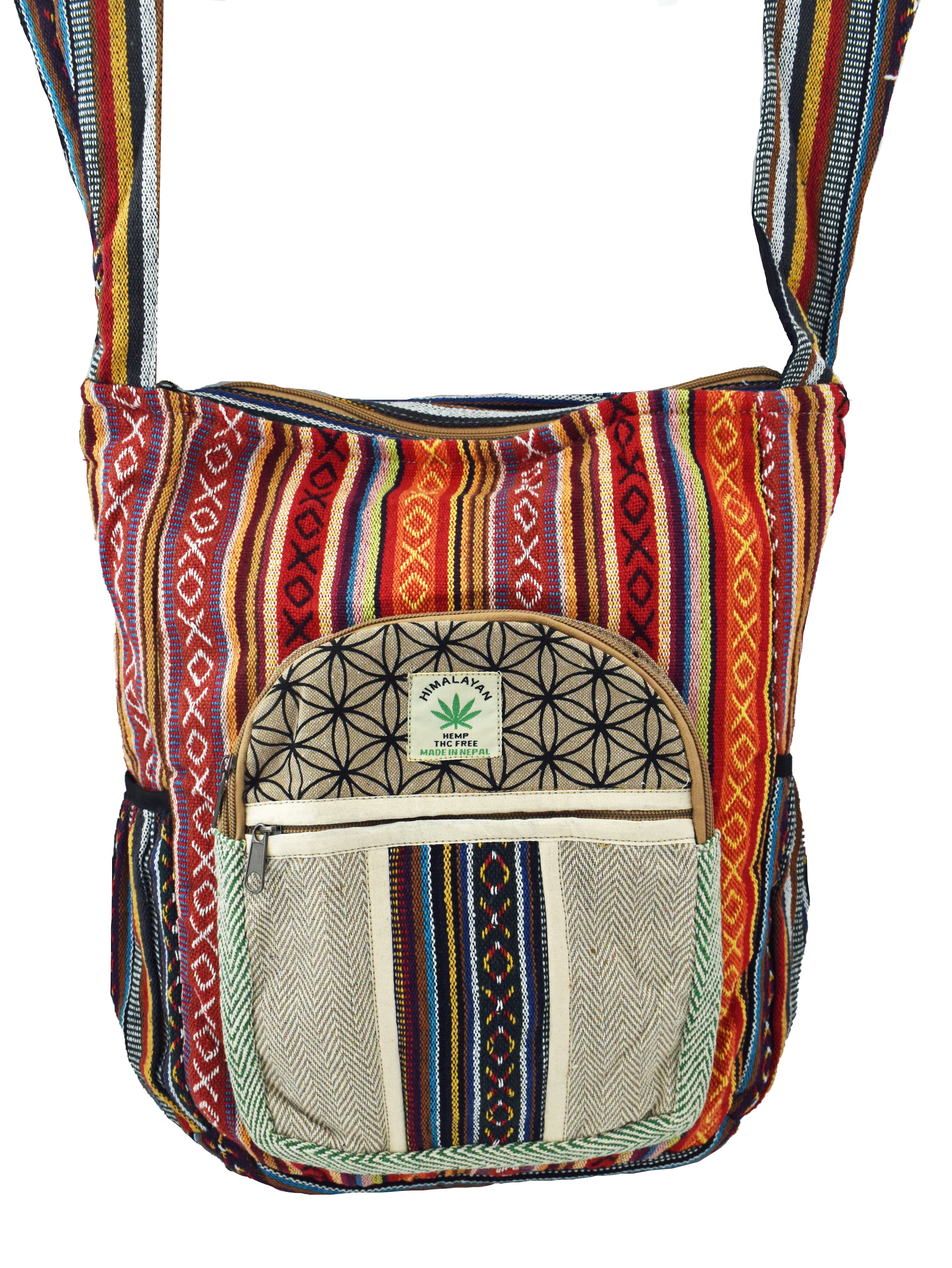 These shoulder bags are made from woven cotton and can be worn on one shoulder or slung across the body - in the style of the bags worn by Saddhu and monk holy men in India and Nepal.  Each bag is lined in black cotton with one main compartment which closes with a zip. On the front of the bag are two more zip pockets.  Large enough as an every day bag.